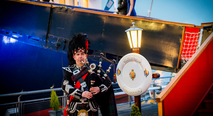 Whilst I’m very proud to be the piper on Britannia and Fingal, I also own Alba Entertainments, which is a corporate entertainment business. We have various types of bands and solo artists from background music through drinks and cocktails, through to your party band for evening. We often supply Britannia with the grande finale of a Pipe Band Beat Retreat to finish off the night in style.