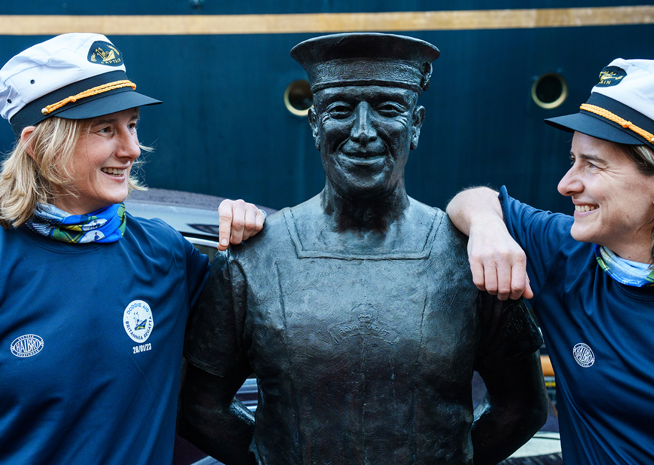 Olympians Sarah Winckless and Dame Katherine Grainger pose next to the statue of longest serving Royal Yachtsman, Norrie.