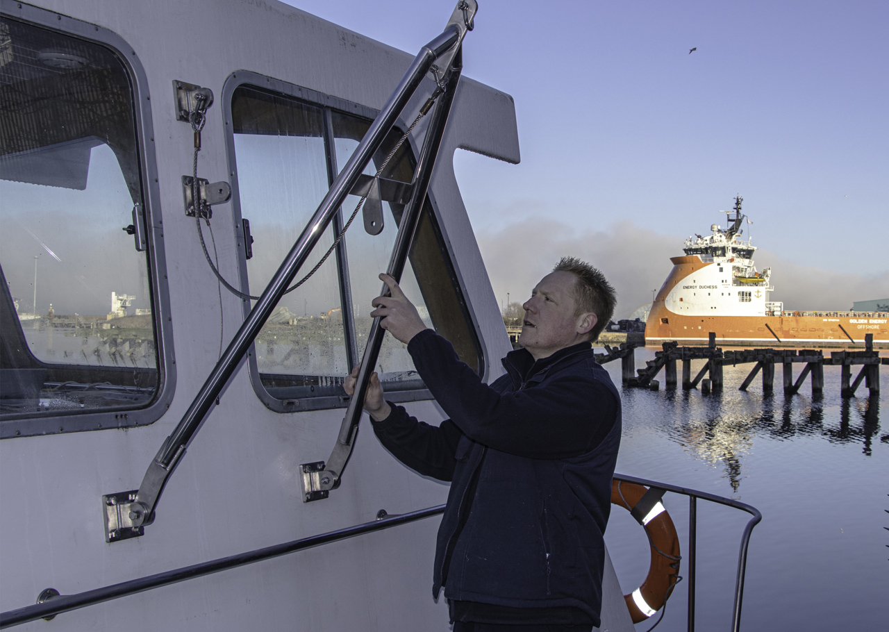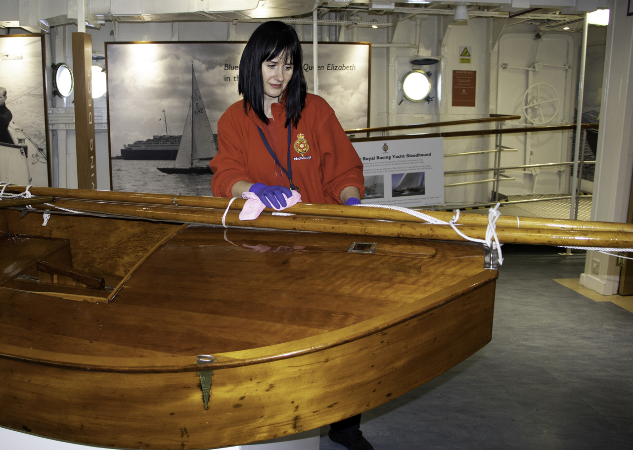 Housekeeper, Angelina, in the Royal Sailing Exhibition, polishing Tui, a 1923 sailing dinghy, gifted to HM Queen Elizabeth II during a visit to New Zealand.