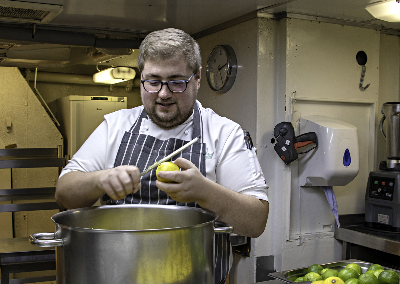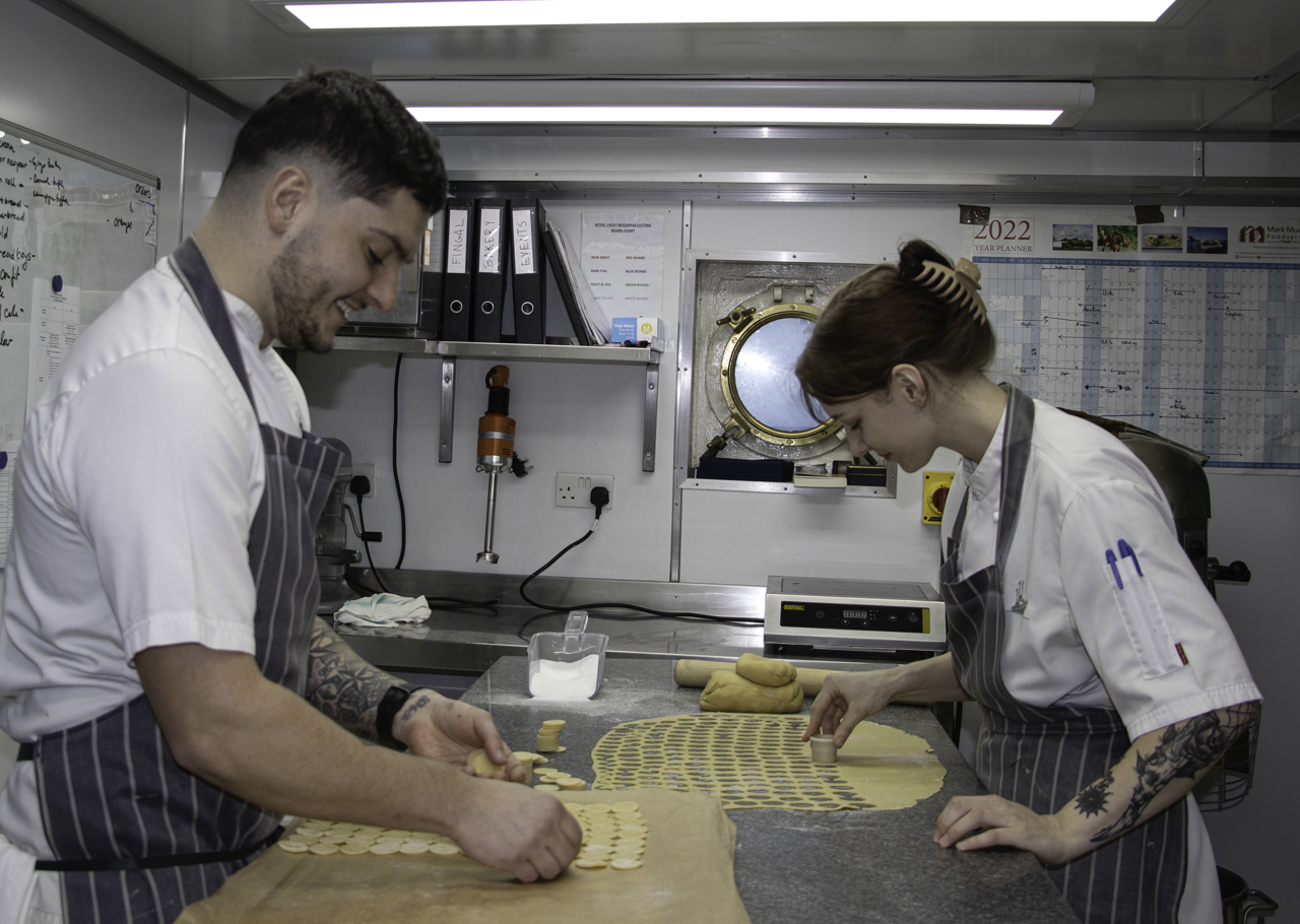 Bob, Junior Sous Chef and Amelia, Demi-Chef de Partie, cutting out melt in the mouth shortbread rounds in the Pastry Galley.