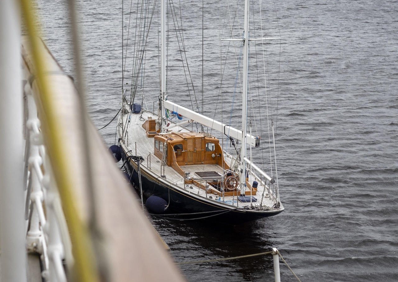 Following maintenance works, Prince Philip’s former Royal Racing Yacht Bloodhound was berthed alongside Britannia.