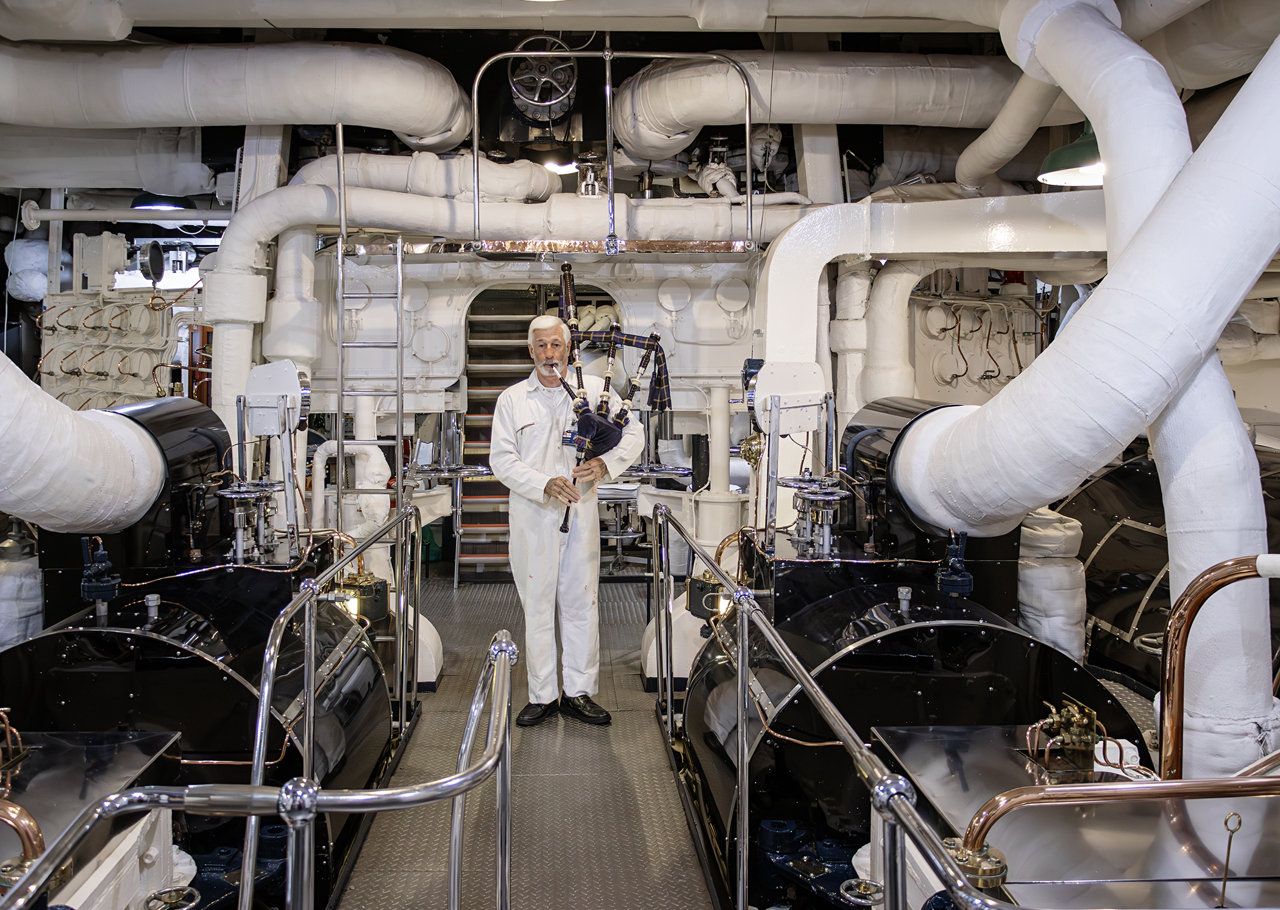 Yottie, Bob, a former Leading Marine Engineering Mechanic, piped in the pristine Engine Room during the annual Yotties' week.