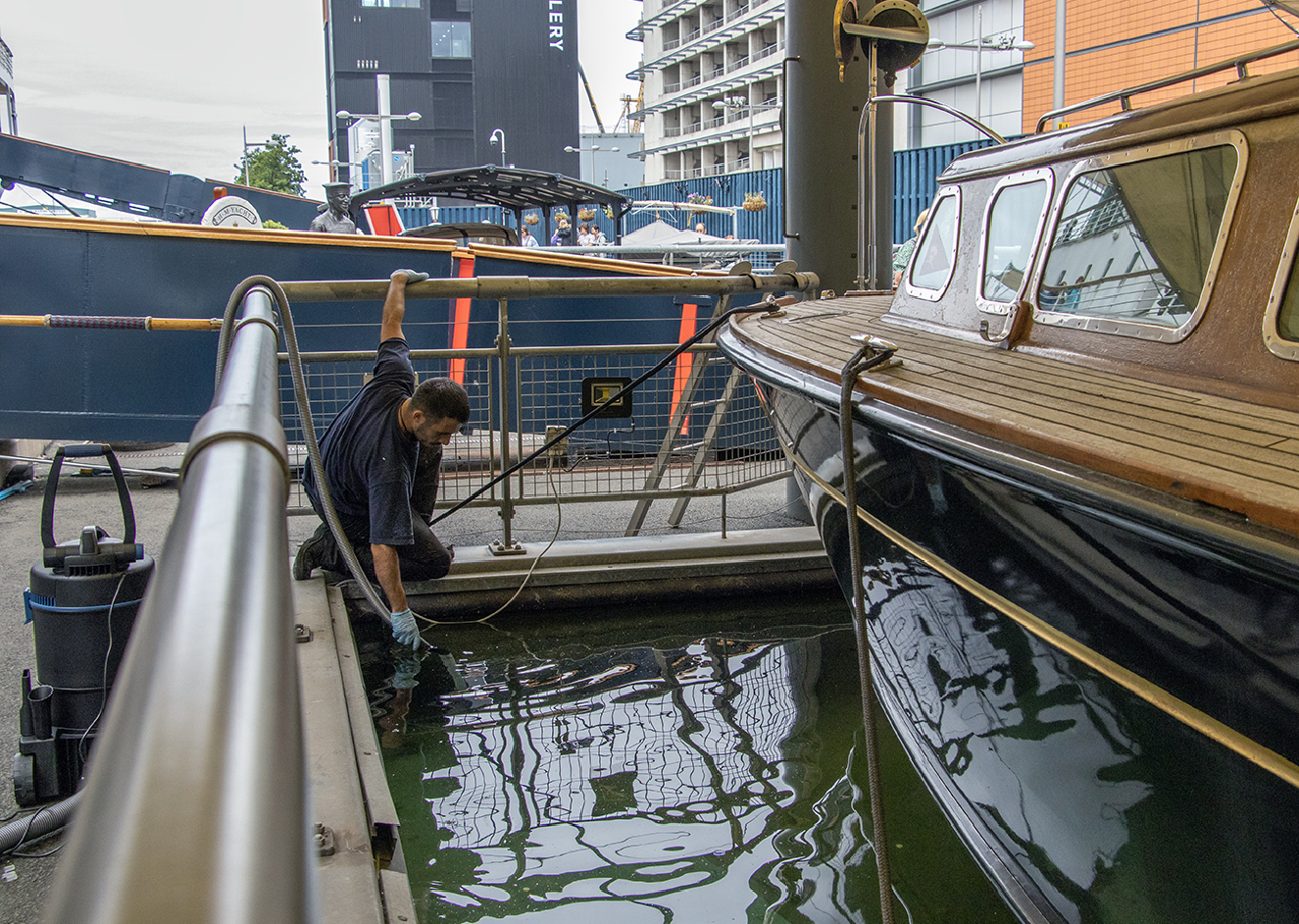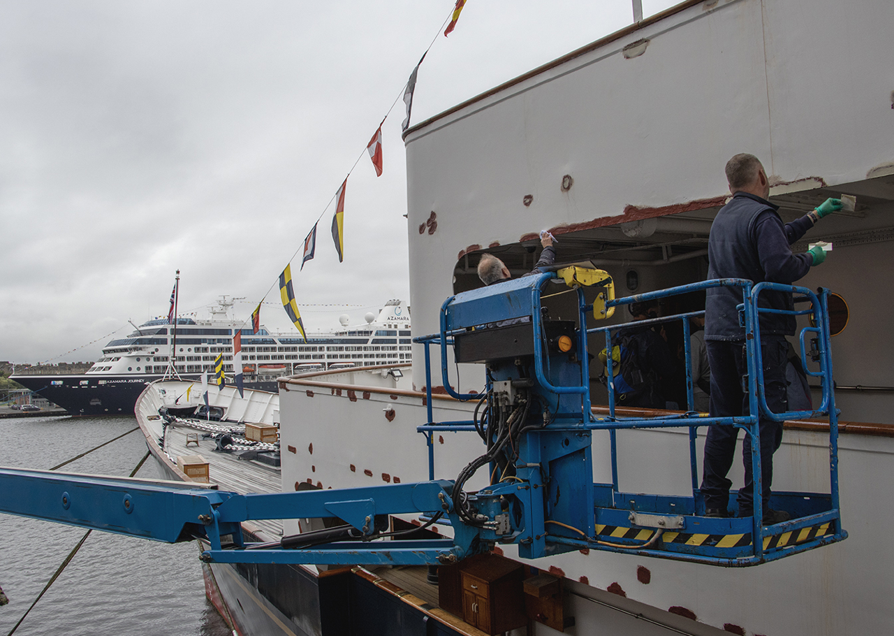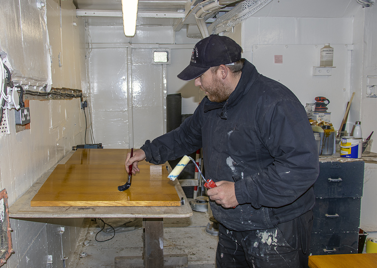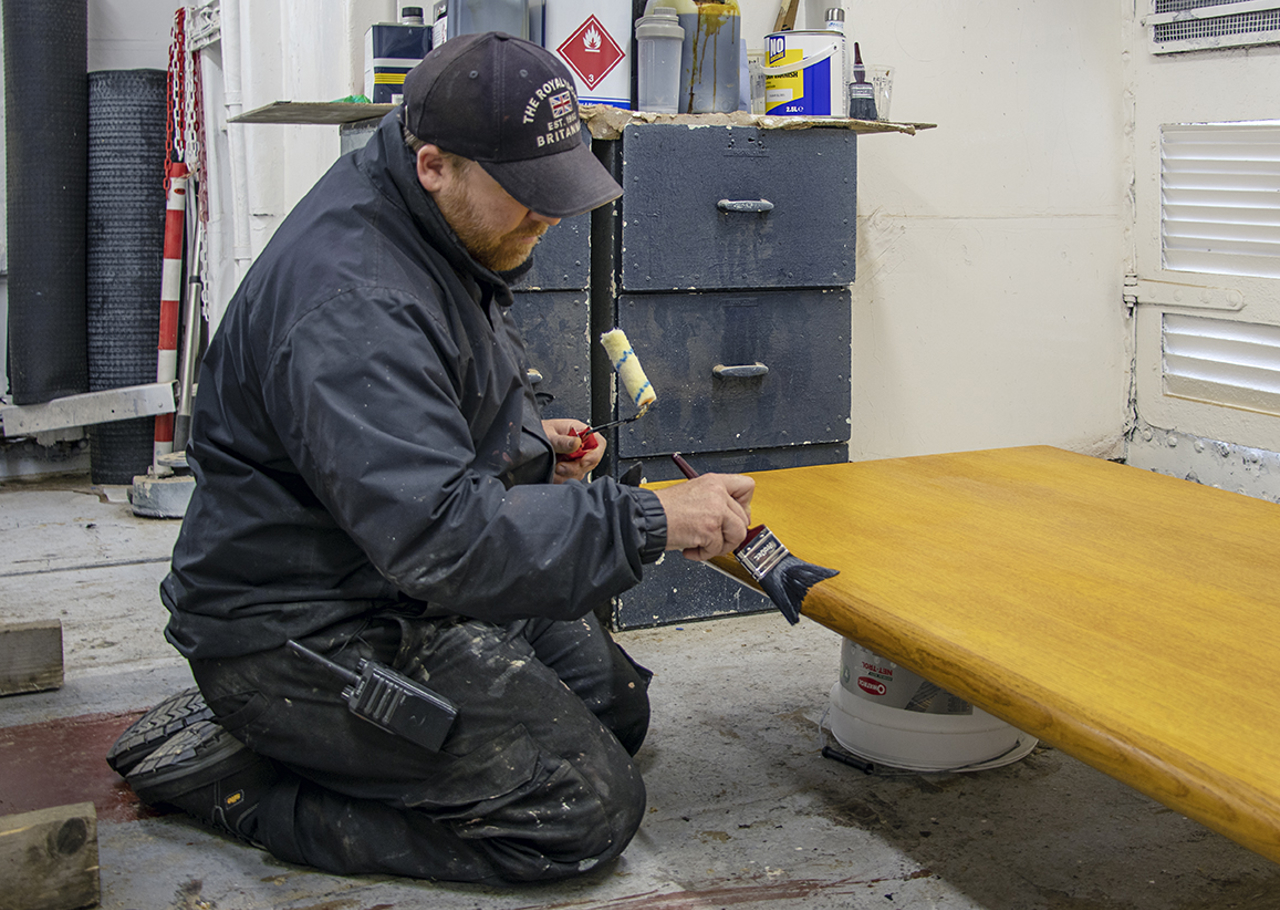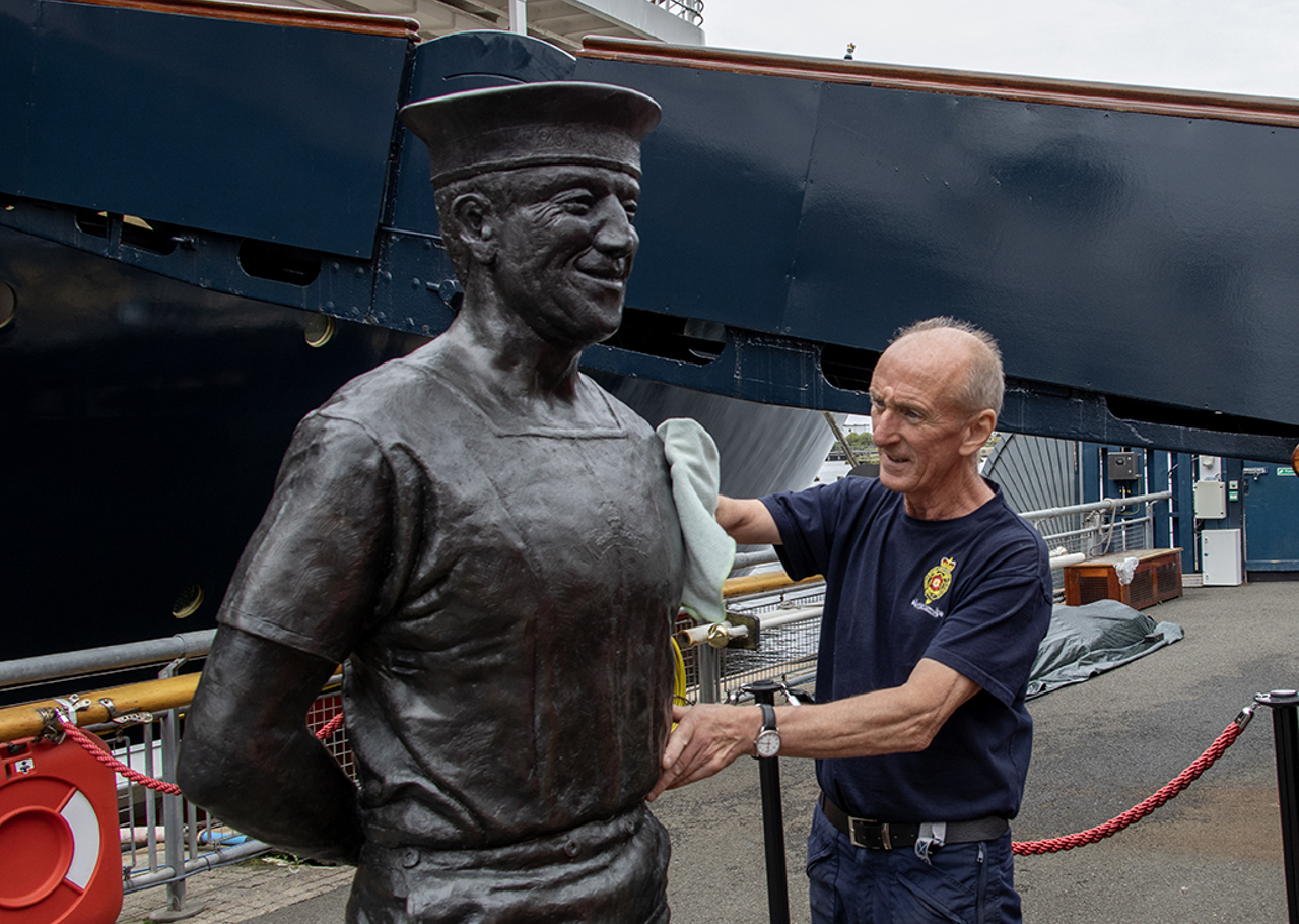 Senior Facilities Officer, Ricky, polishing the bronze statue of Ellis 'Norrie' Norrell MVO RVM, Britannia's longest serving Royal Yachtsman who served on board for 34 years.