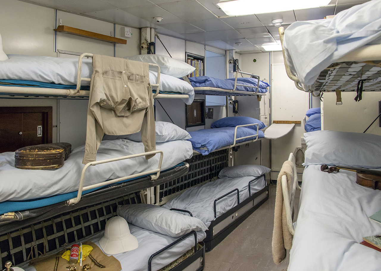 The Royal Marines' bunk beds in their Barracks, with instruments and items from some of the 26 different uniforms they wore according to Royal protocol.