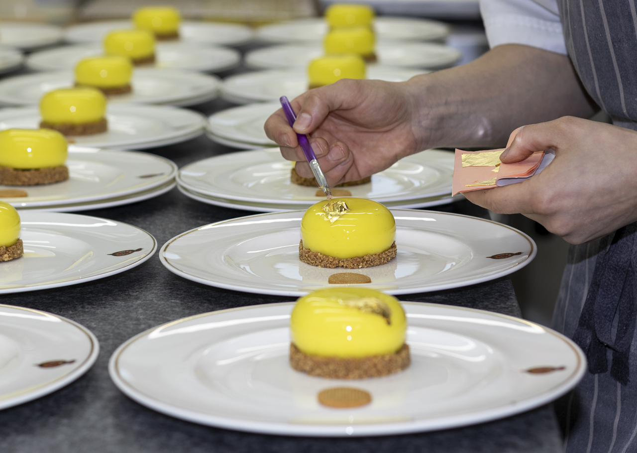 Chef de Partie, Amelia, adding edible gold leaf to lemon cheesecakes for an exclusive evening event on Britannia.
