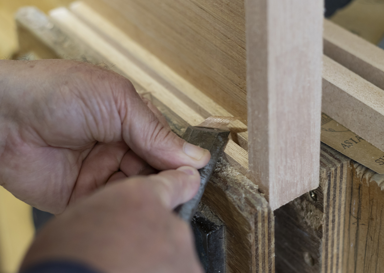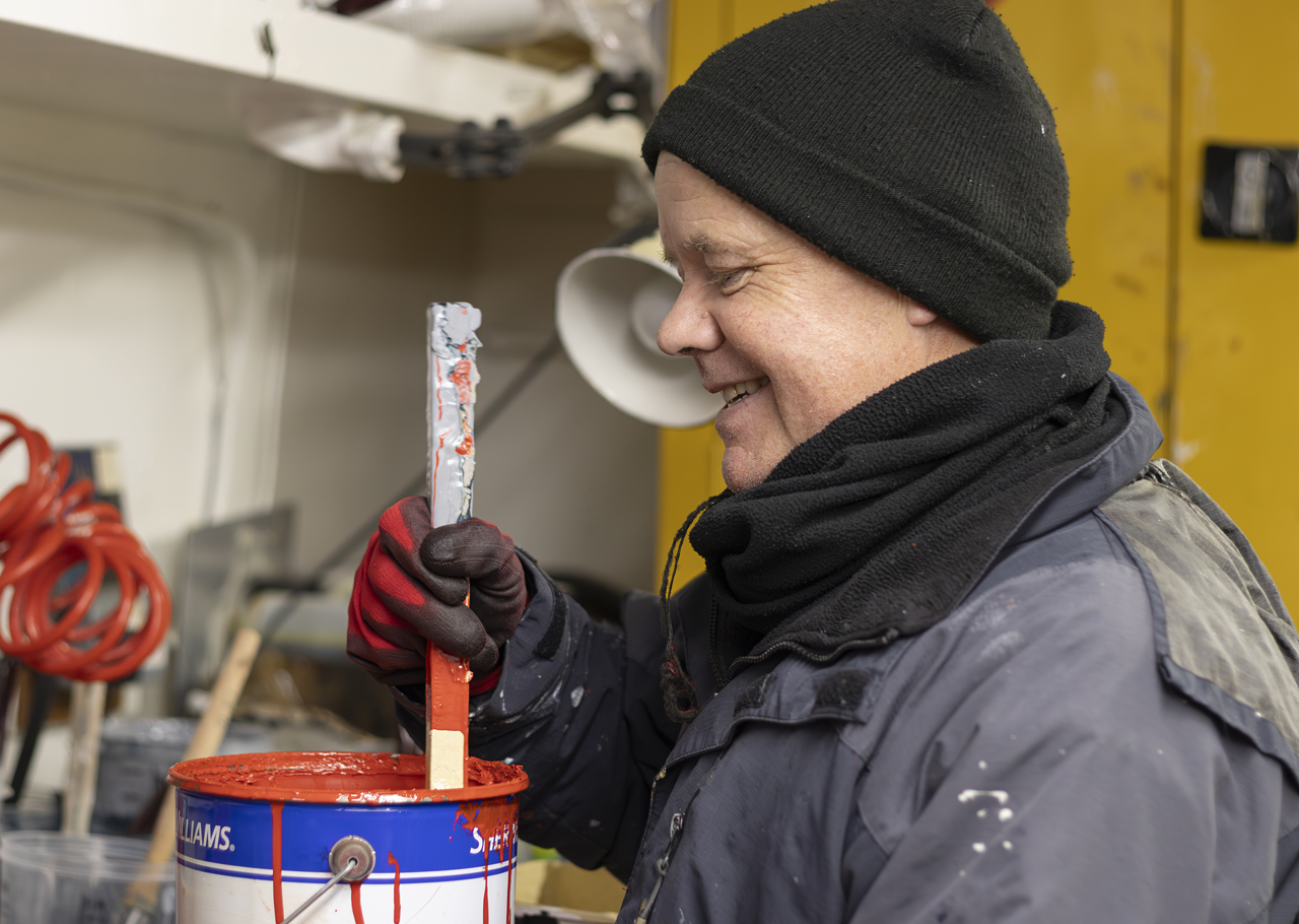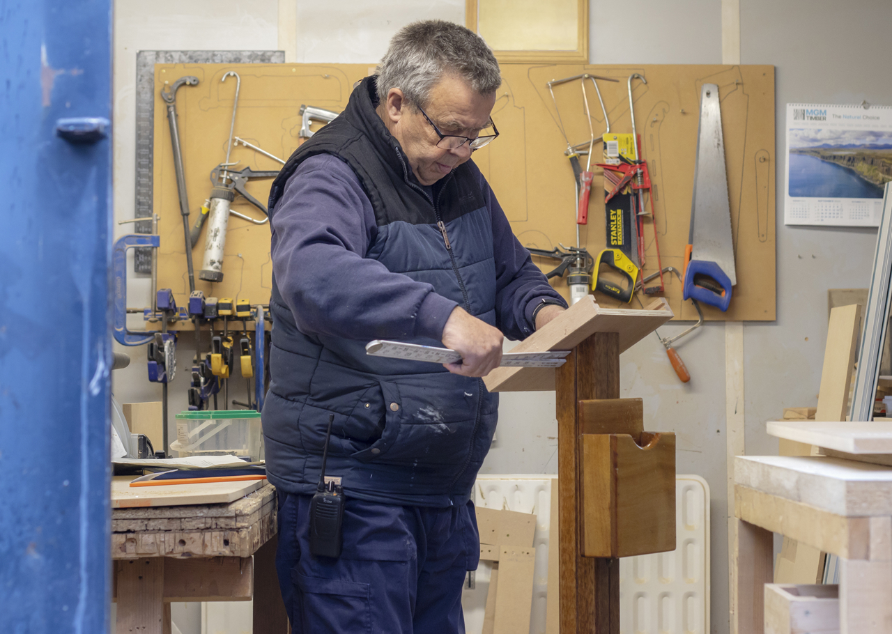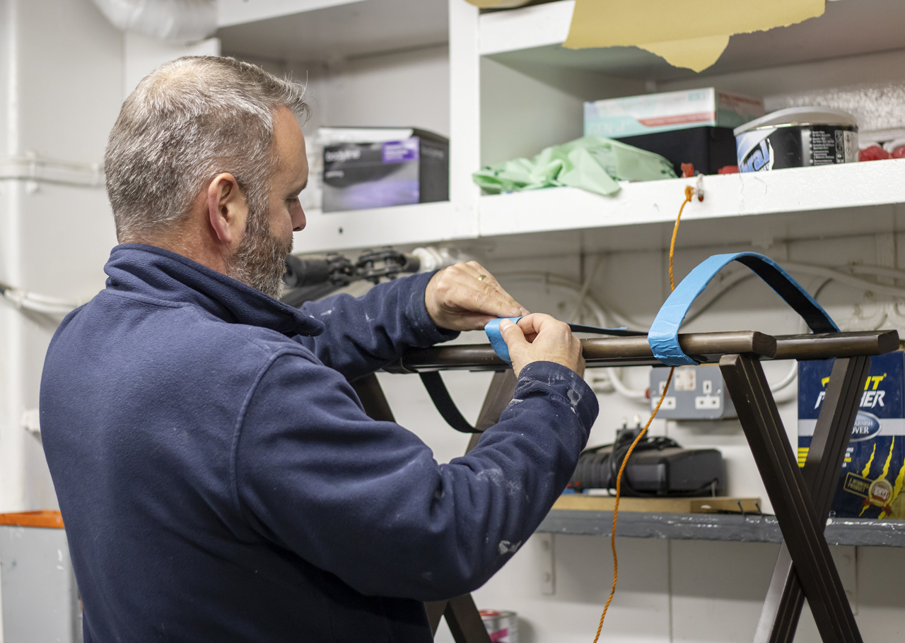 Joss taping a luggage stand from Britannia's sister ship, luxury floating hotel Fingal, in preparation for it to be varnished.