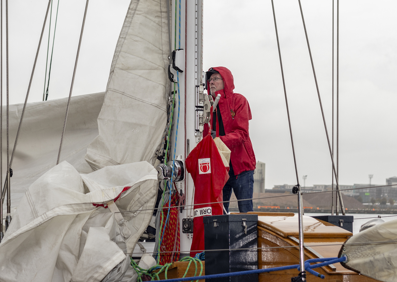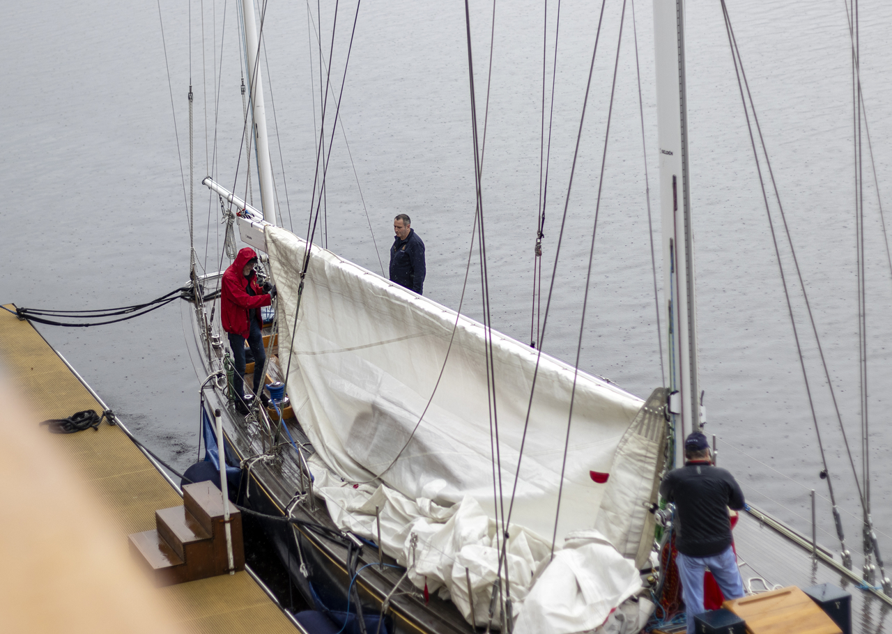 Colin, Chris and a former Royal Yachtsman, hoisting the sail aboard the former Royal Racing Yacht Bloodhound.