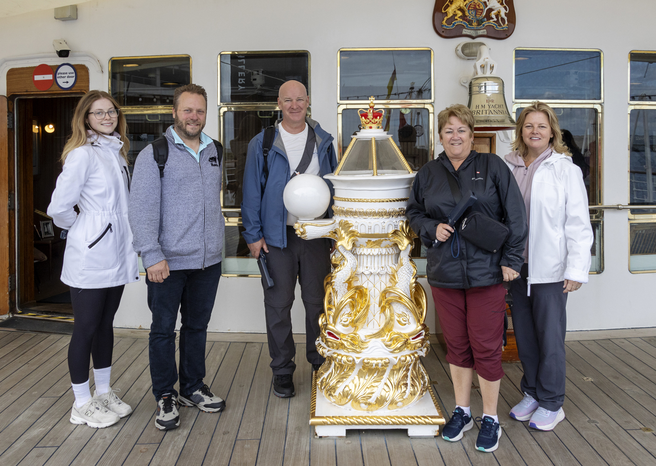 A group of visitors pose for a photo at The Royal Yacht Britannia's beautifully ornate compass binnacle on the Verandah Deck.