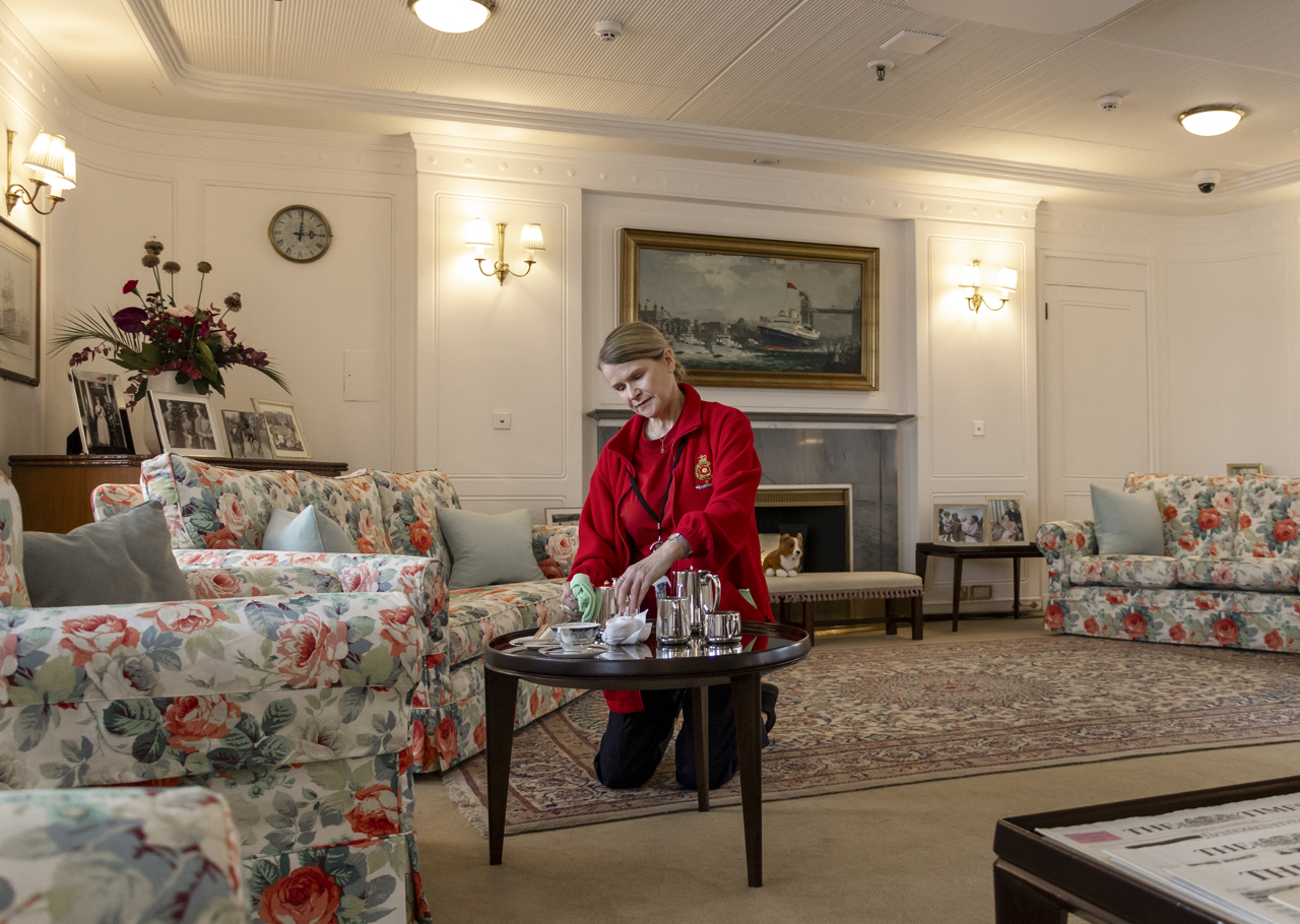 Lynne, Housekeeper, polishing the tea set in the State Drawing Room, the place where the Royal Family would come together to relax.