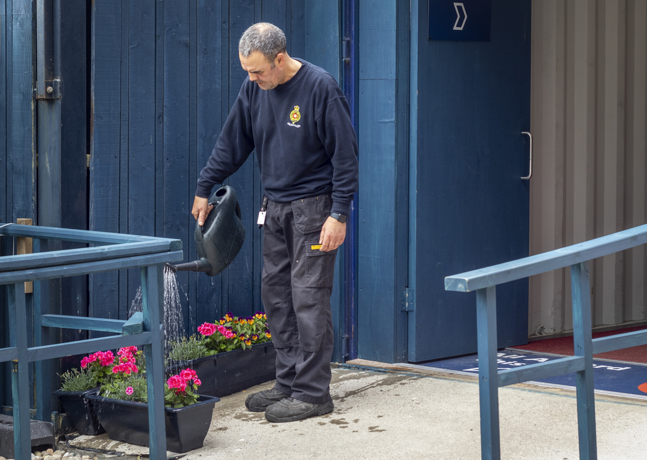 Facilities Officer Kirk, watering the floral planters at the visitor entrance, keeping the blooms vibrant.