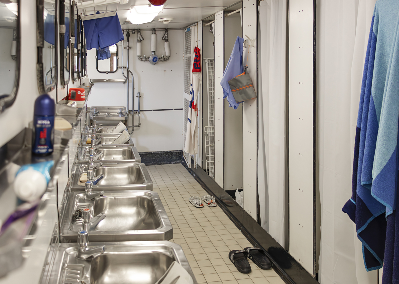 The Junior Ratings Shower Room contained the only showers aboard for all 150 Junior Ratings. There was a strict time limit for showering and hot water was limited which meant the last ones in endured cold showers!