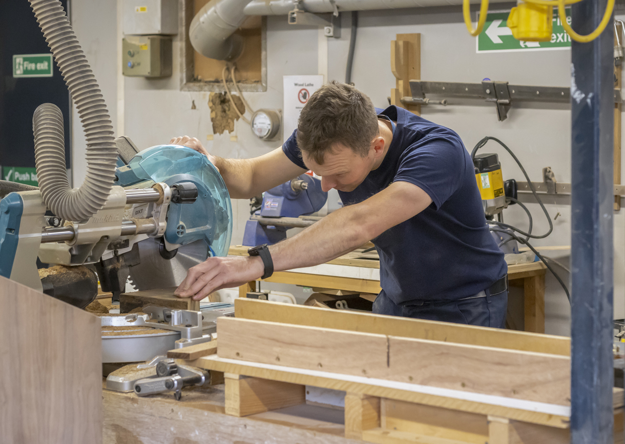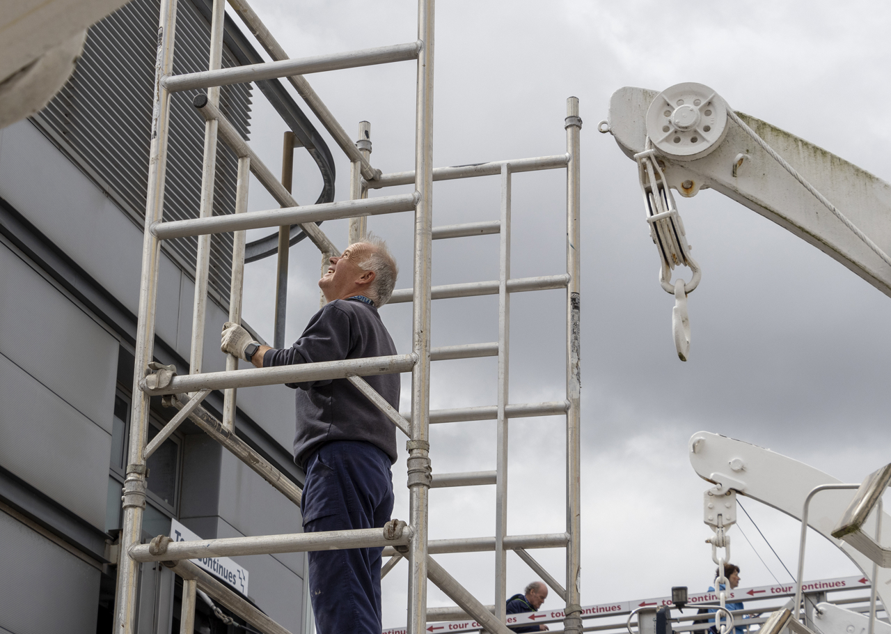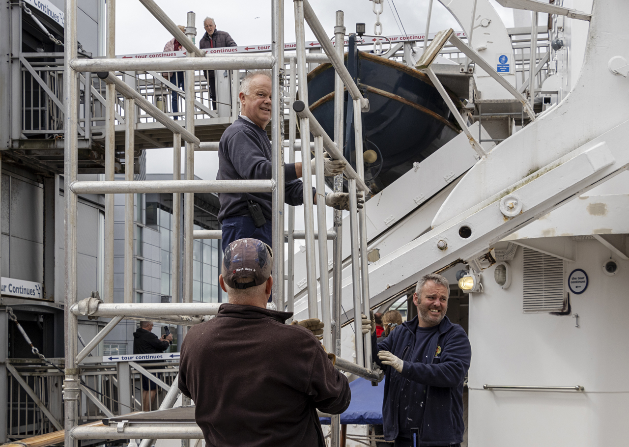 Nigel, Rab and Jos building scaffolding on the Port Shelter Deck in preparation for painting on the davits.