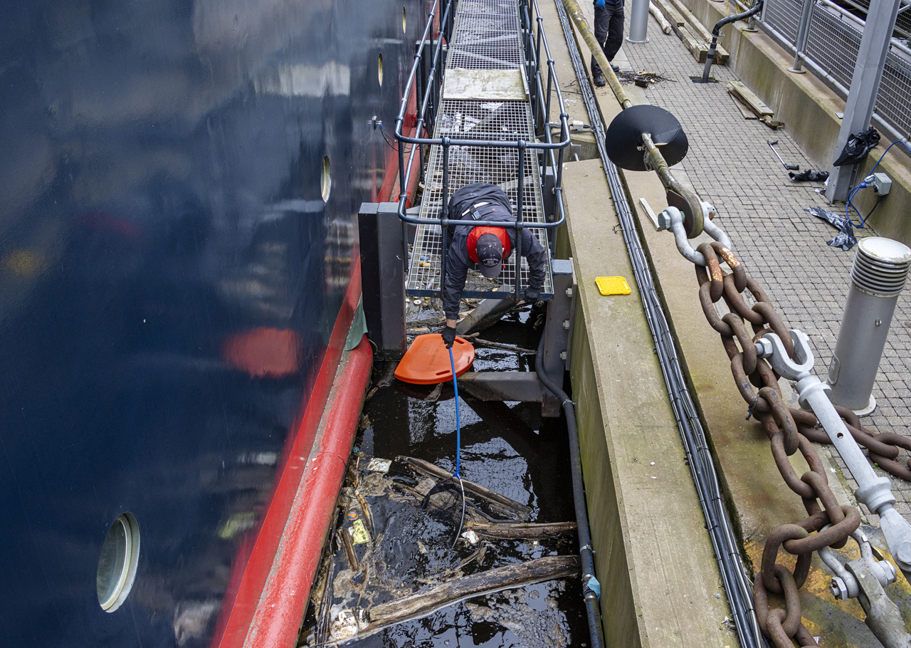 Stevie litter picking from the water. Following heavy rainfall, debris is often washed into the locked harbour, via the Water of Leith River, which is 20 miles long. The Maintenance team work to clean the area on a regular basis.