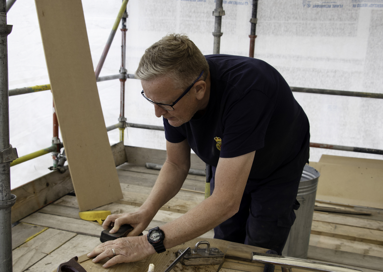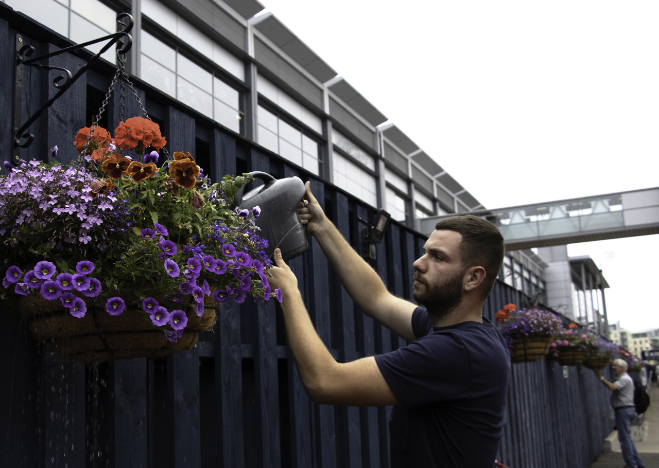 On the quayside, Facilities Officer, Steven, watering the hanging baskets.