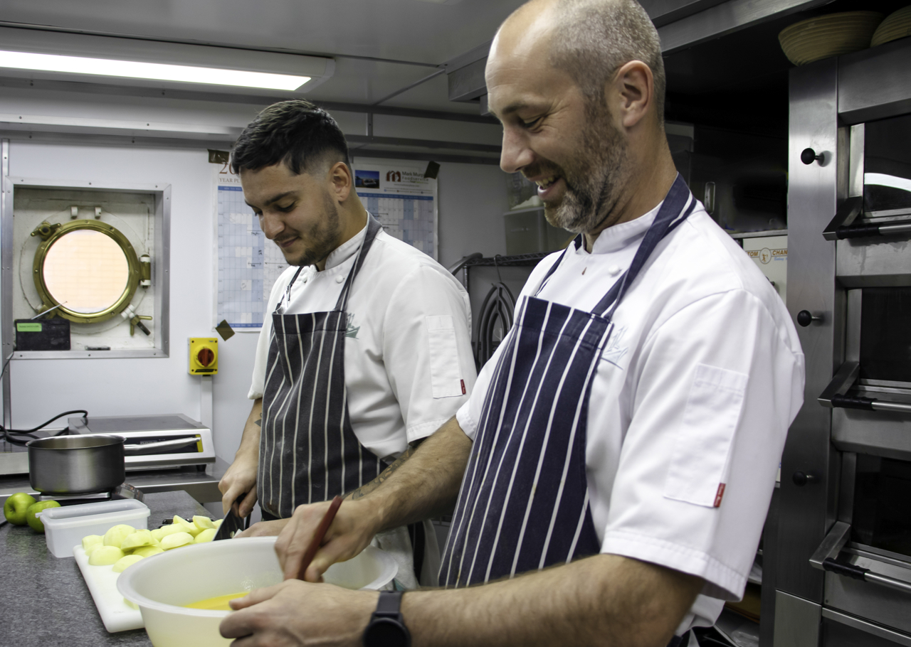 Bob, Junior Sous Chef, and Stephen, Executive Pastry Chef, preparing desserts in the Pastry Galley.