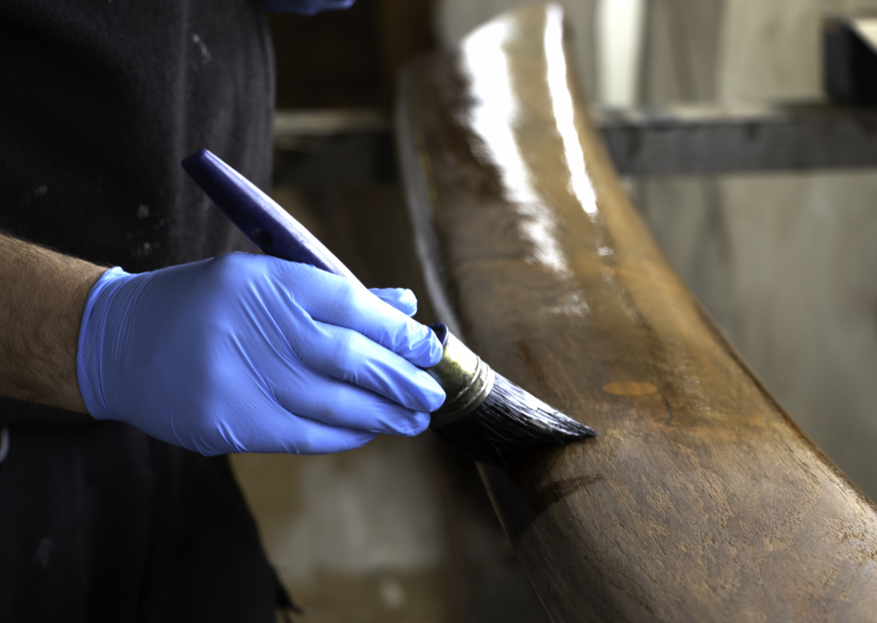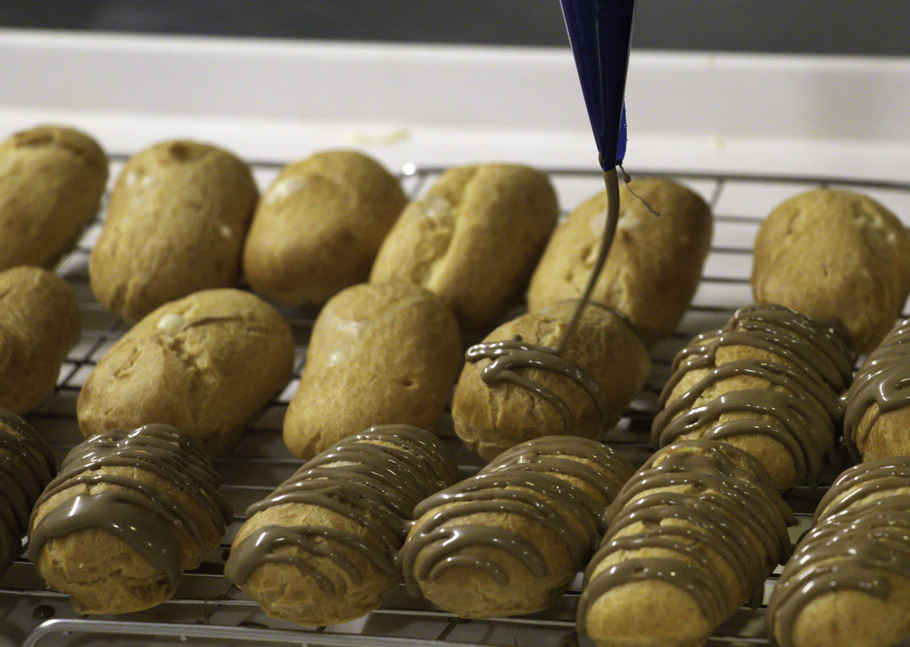 Chocolate is expertly applied to coffee and banana éclairs to be served during Afternoon Tea.