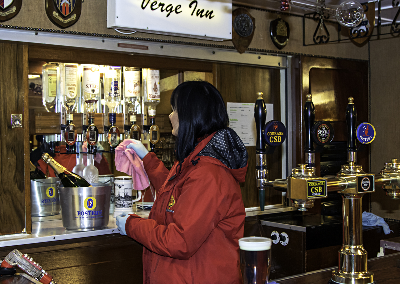 Angelina, Housekeeper, polishing at the Verge Inn bar in the Petty Officers’ and Royal Marines Sergeants’ Mess, where the crew would relax.