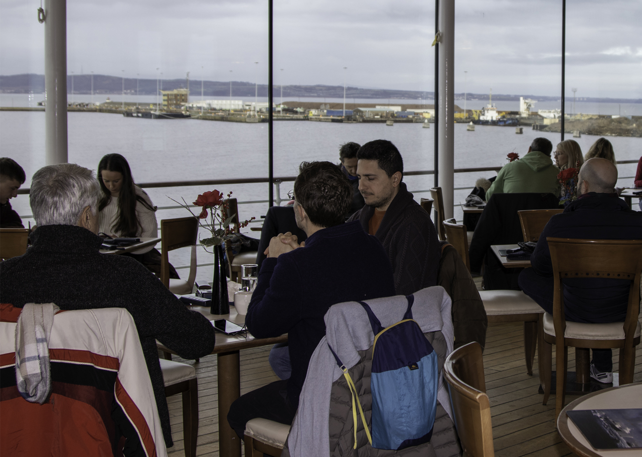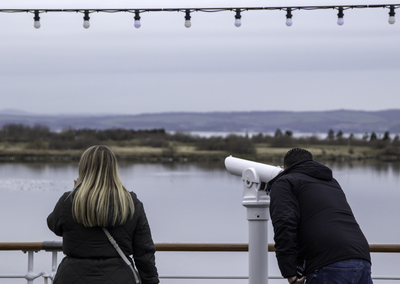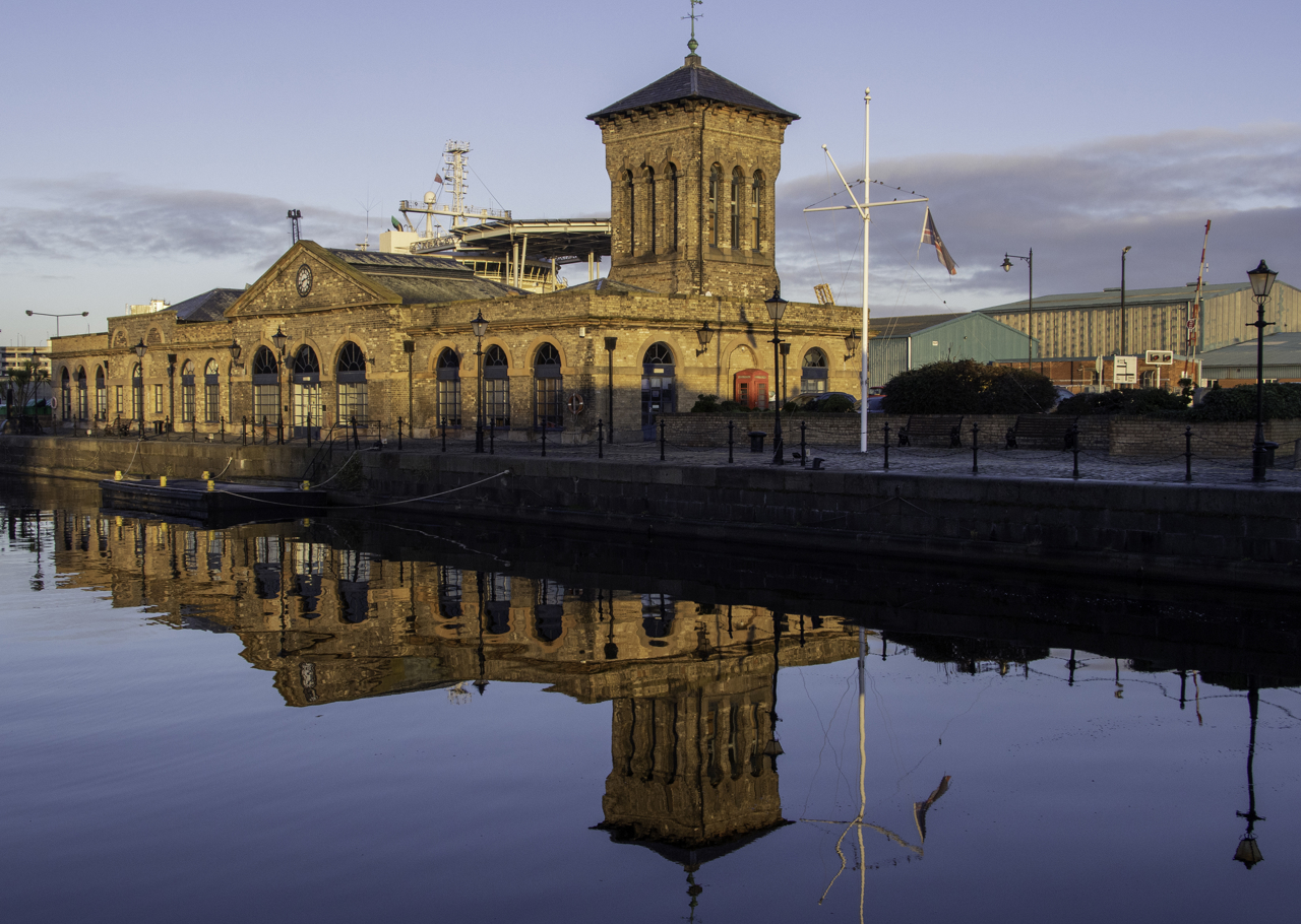 A bright, still winter’s day across Alexandra Dock at Fingal, Britannia’s sister ship and luxury floating hotel.