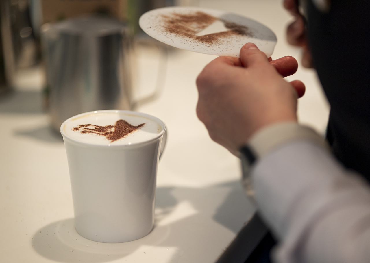 A freshly made cappuccino, topped with a charming chocolate Royal Yacht stencil, awaits a Tearoom guest.
