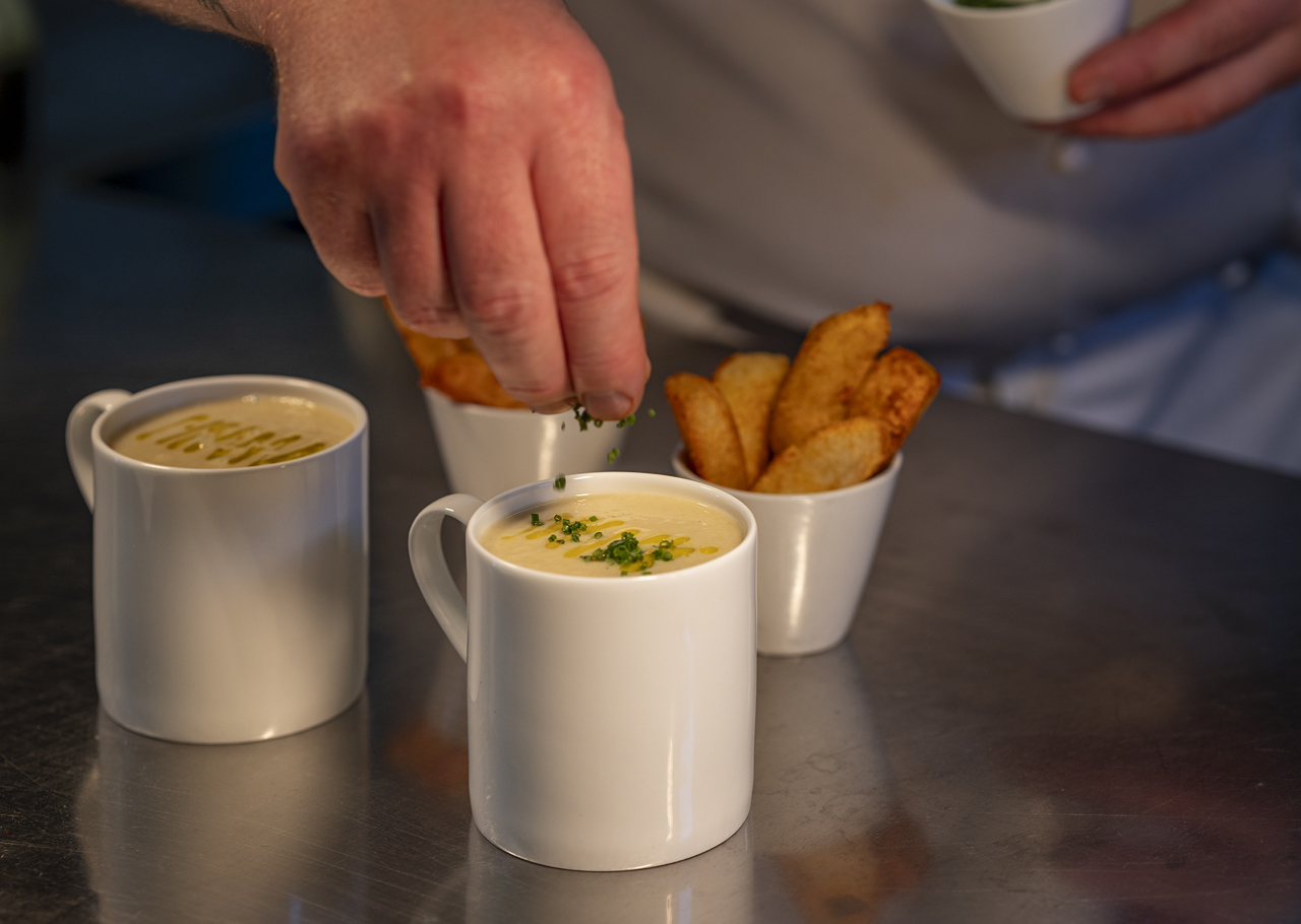 Pawel, Chef de Partie, putting the finishing touches on the Galley's signature soup, cream of Cullen skink.