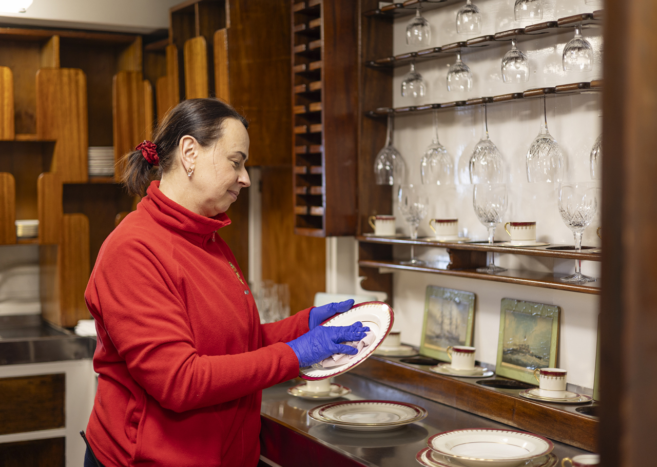 Housekeeper, Renata, carefully cleaning the Minton and Spode china, which was used in the State Dining Room. Each item has its own uniquely designed storage