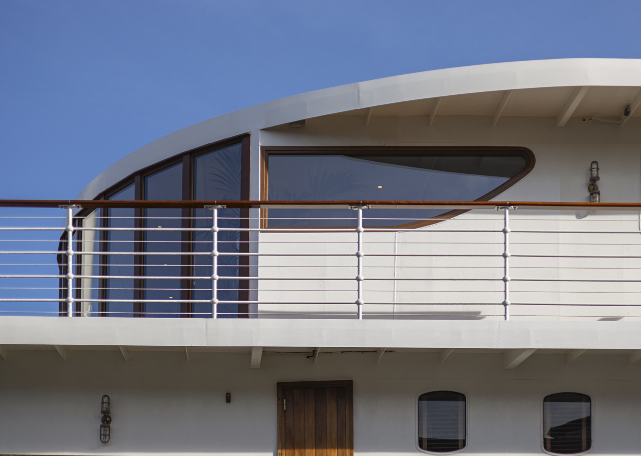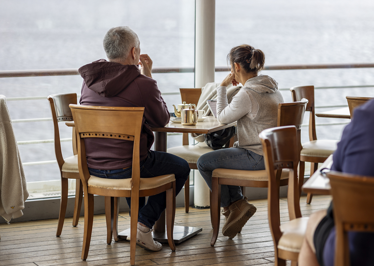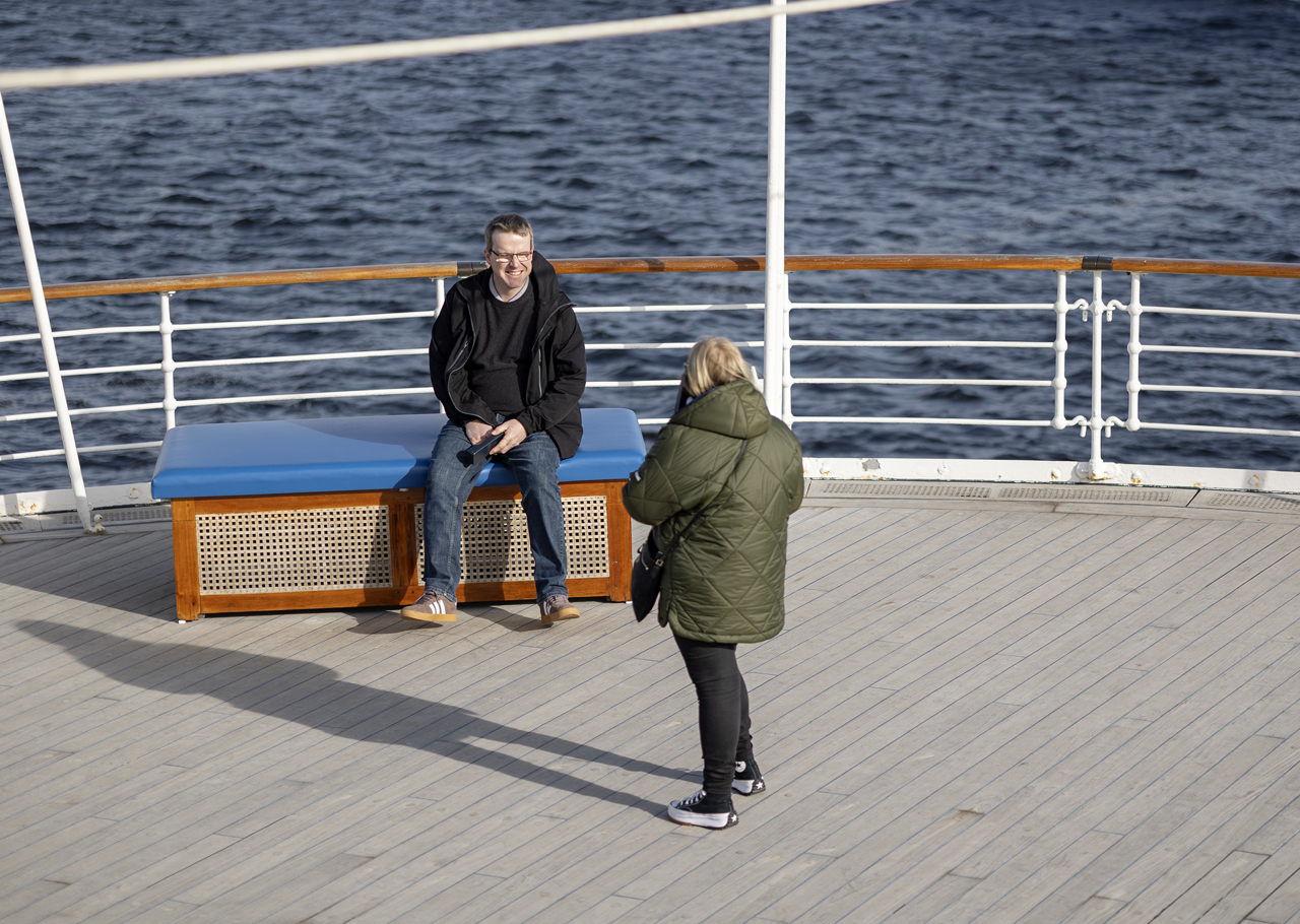 Sunshine on Britannia! Visitors take a moment during their self-guided tour to enjoy the warming sun on the Verandah Deck.