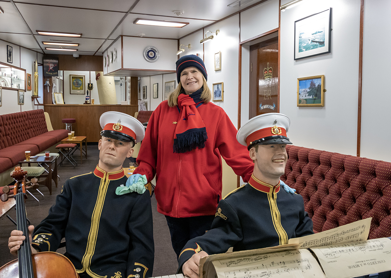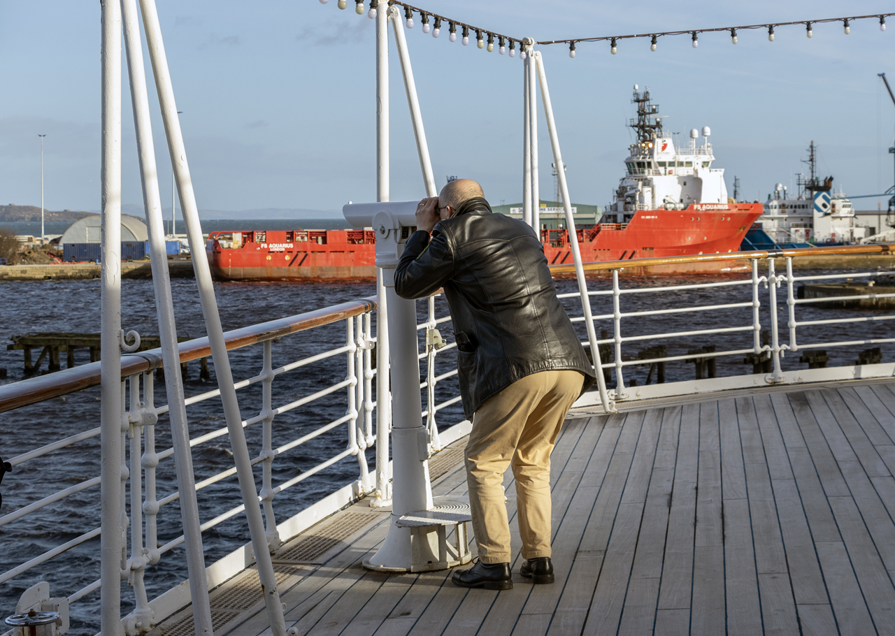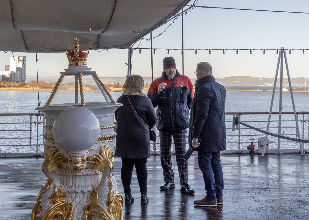 Visitor Assistant, Tim, sharing key facts about Britannia for visitors outside on the Verandah Deck.