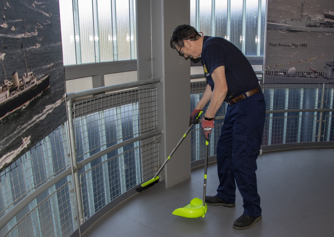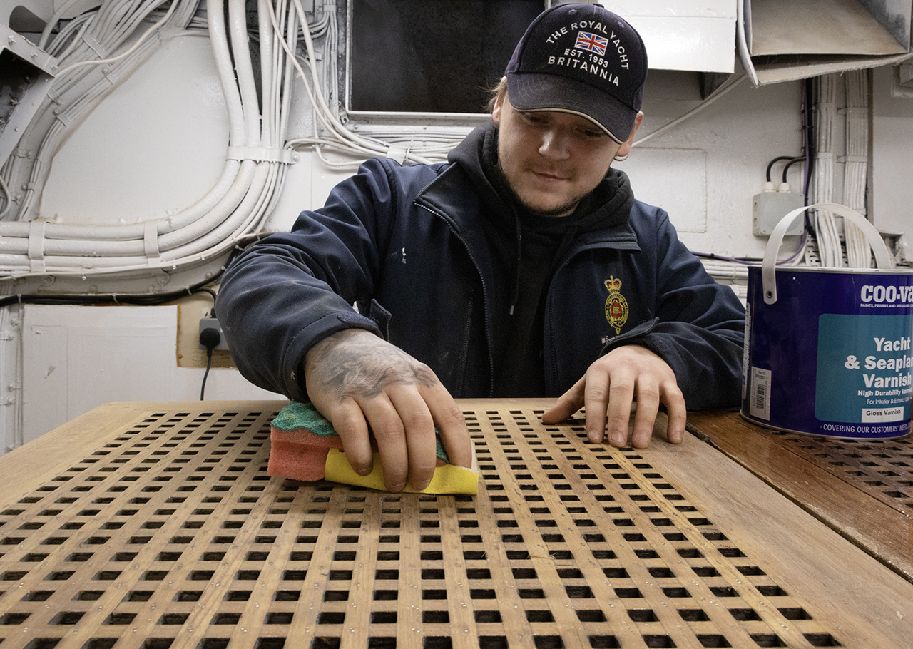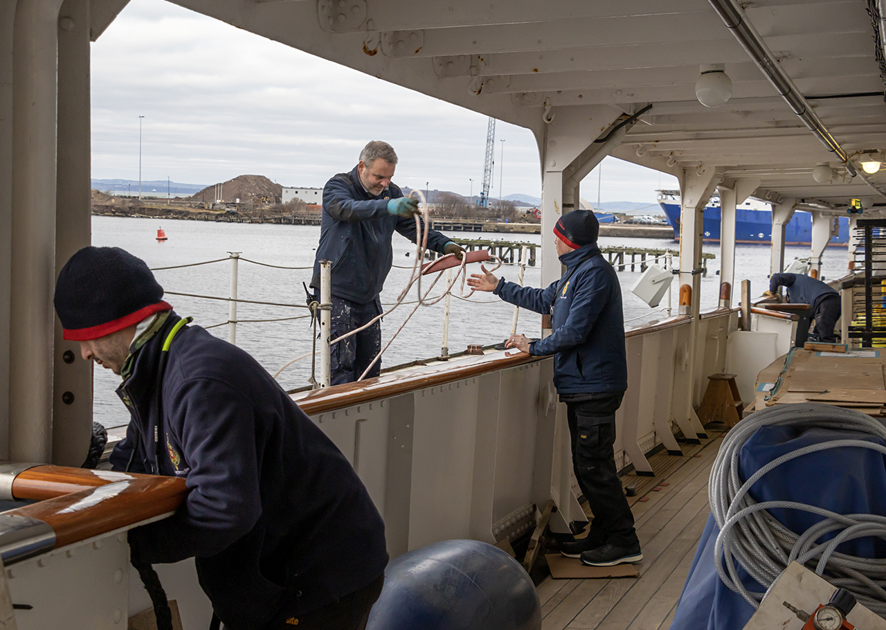 Visitor Assistant, Tim, sharing key facts about Britannia for visitors outside on the Verandah Deck.