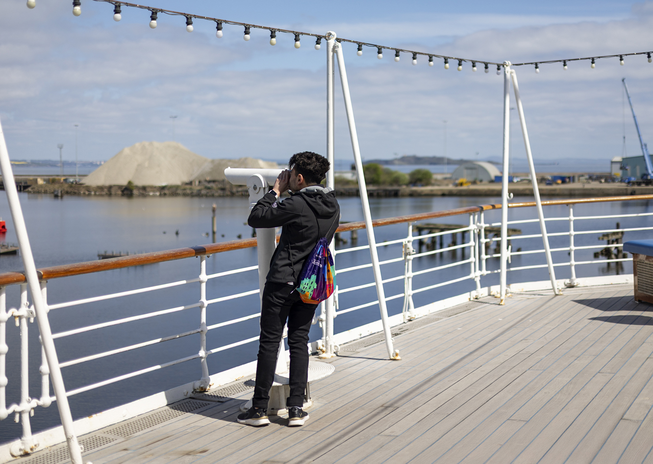 Enjoying a sunny day aboard Britannia, a visitor admires the gorgeous views across the Firth of Forth from the Verandah Deck.