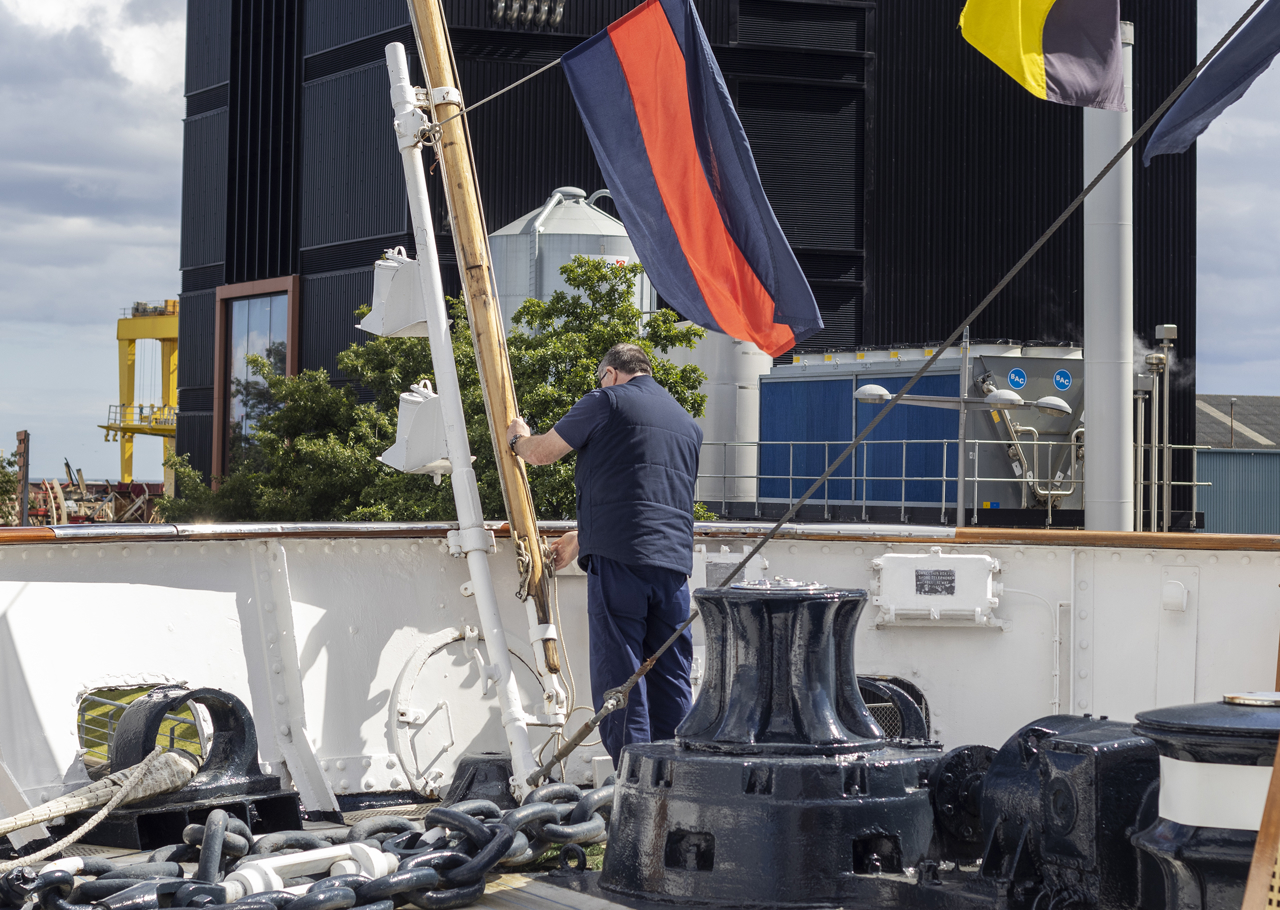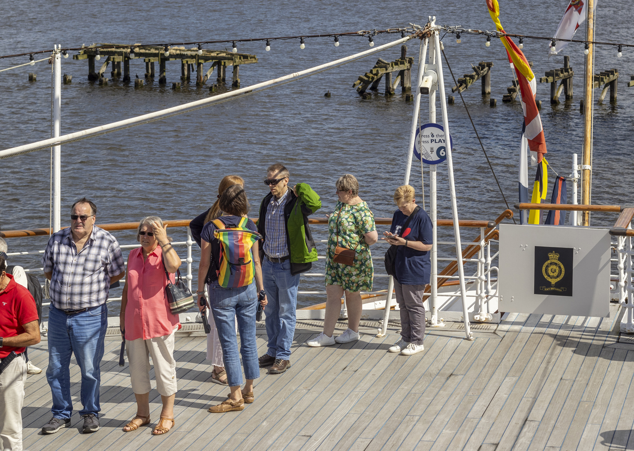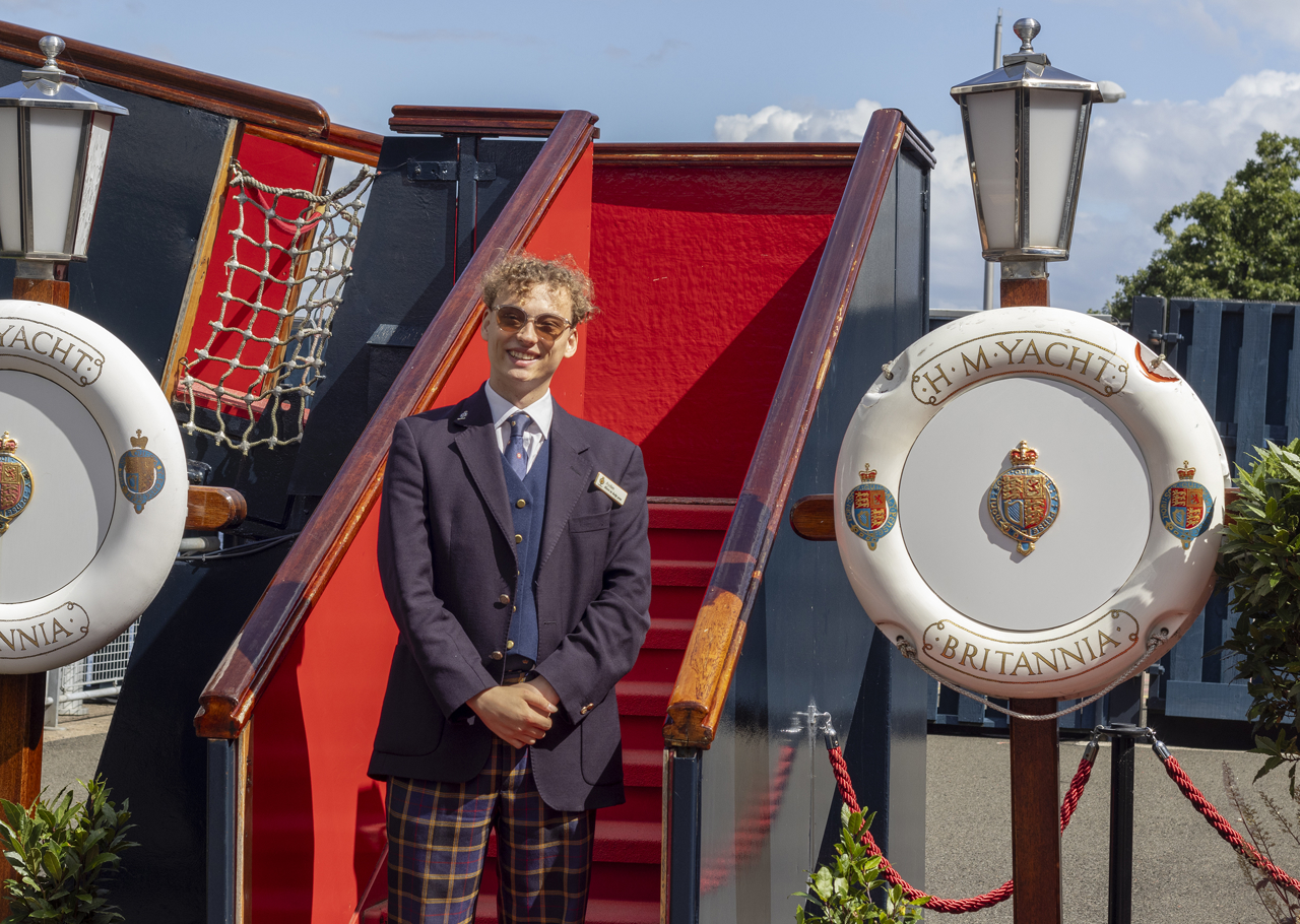Aydan, Visitor Assistant, is ready to capture a memorable photo of visitors by the Royal Brow, once the Royal Family's exclusive entrance to The Royal Yacht Britannia.