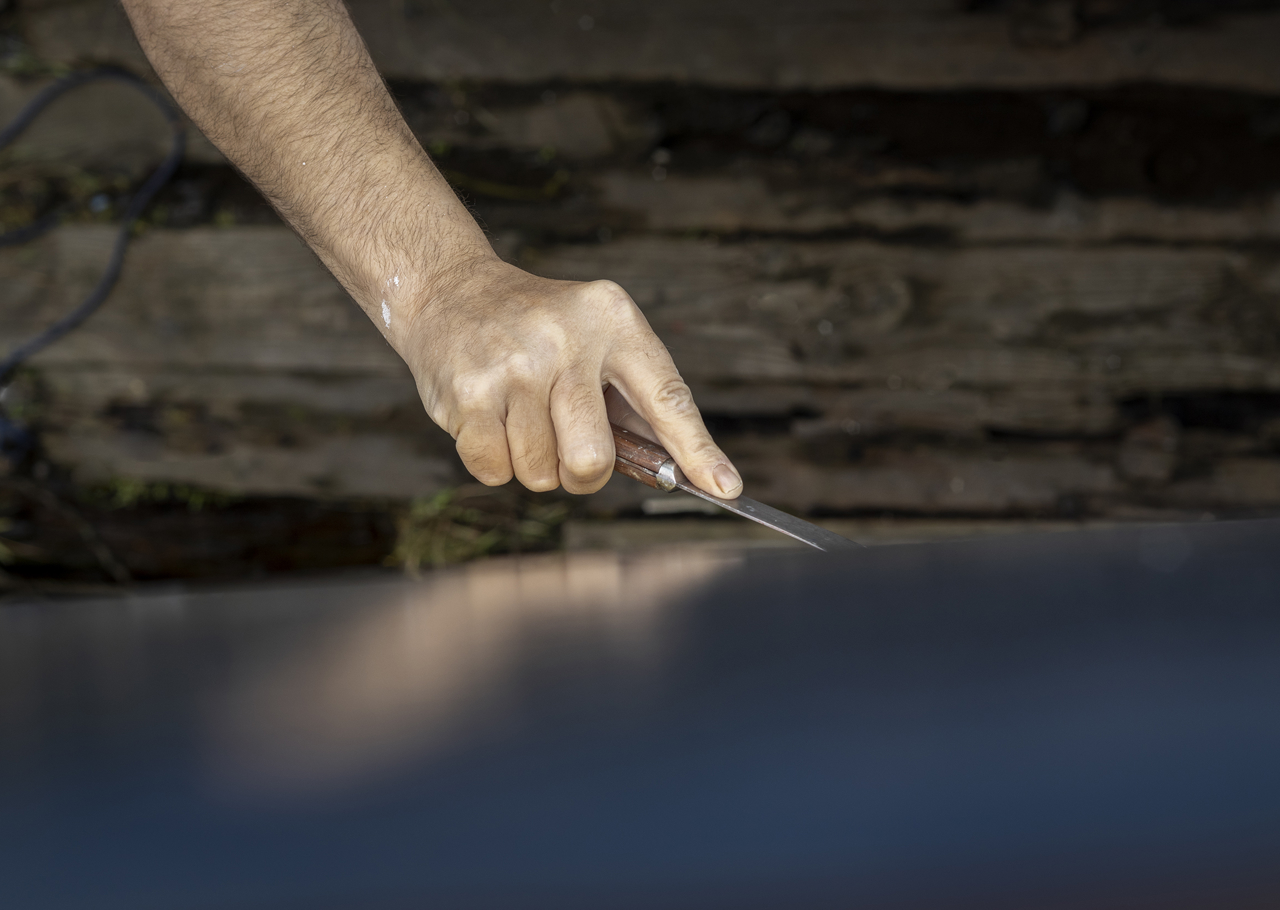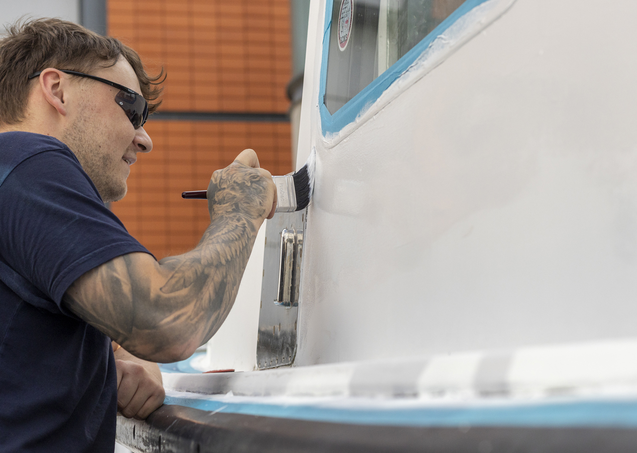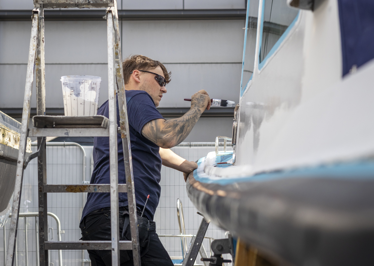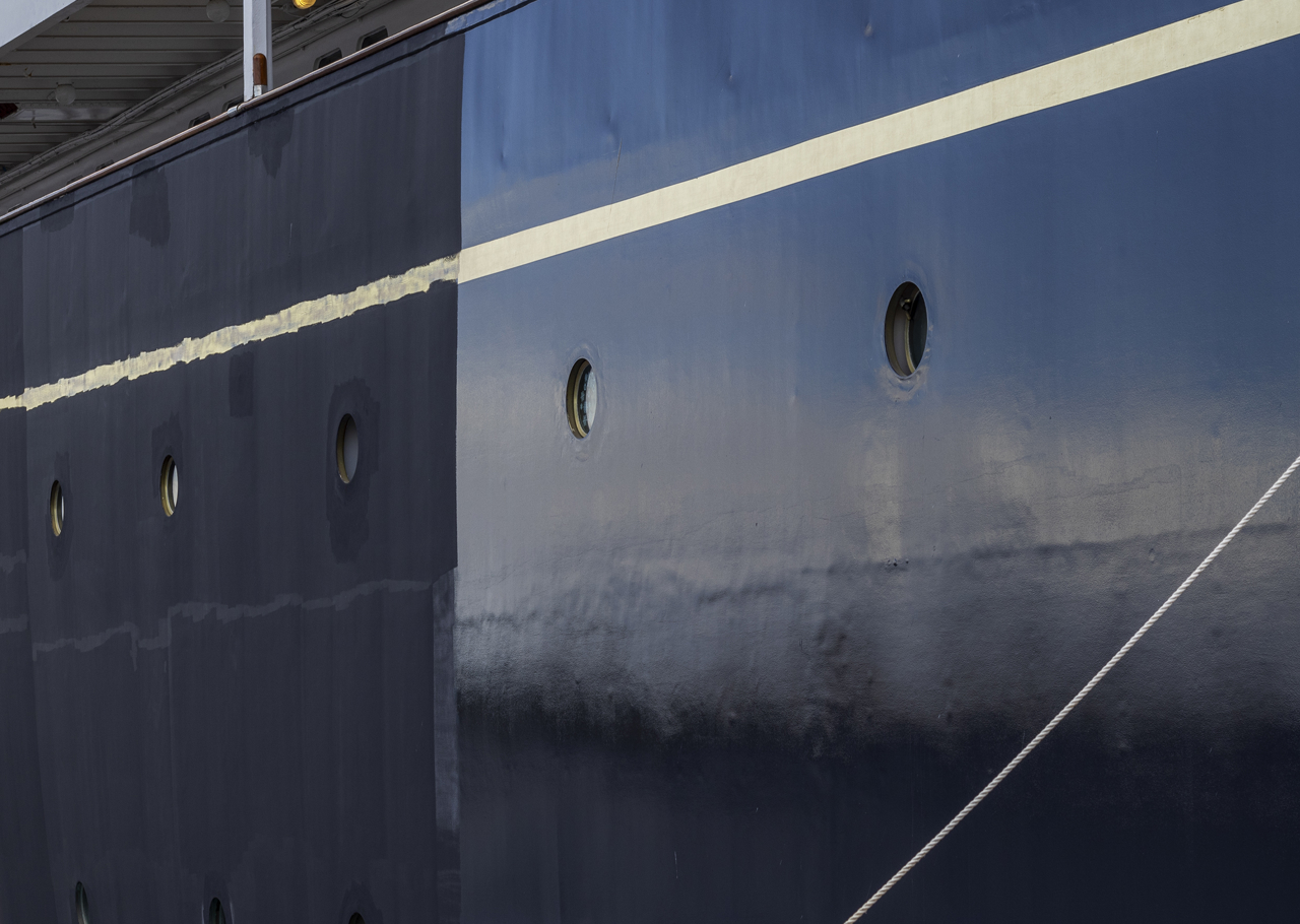 The hull painting is seen in progress. The undercoat is on the left section and the finished panel is on the right, showing preparation through to the end result.