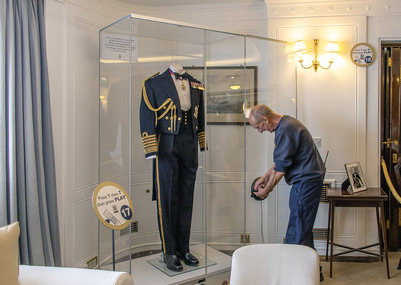 Ricky, Senior Facilities Officer, adds the finishing touches in the Anteroom, to the display of one of Prince Philip's uniforms.