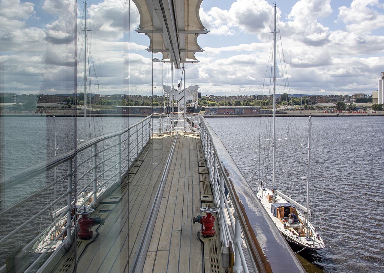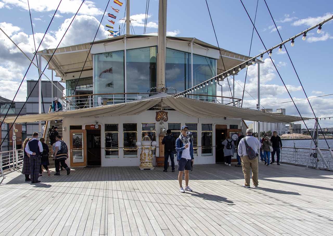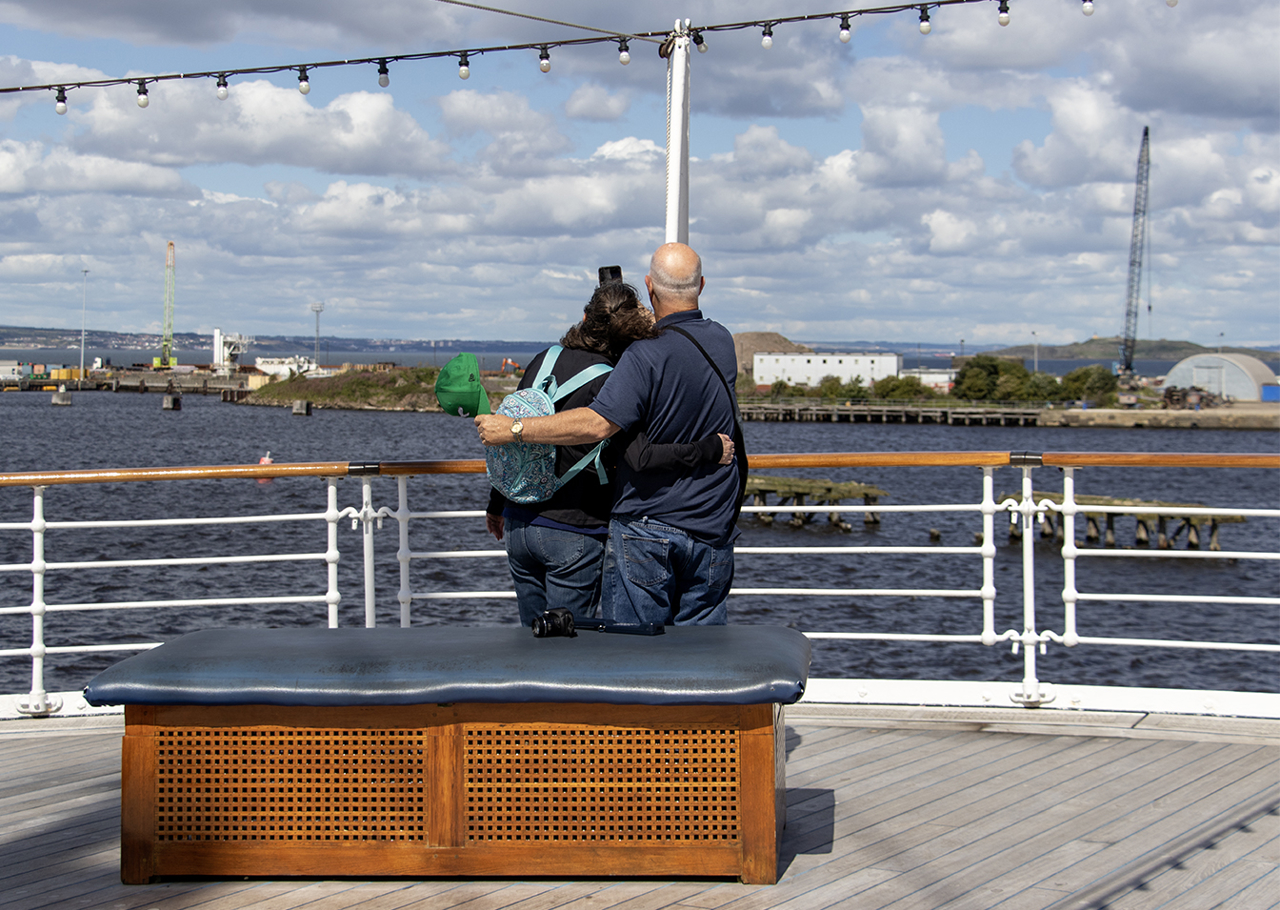 Visitors enjoy the view from the Royal Brow, the special gangway which members of the Royal Family and their guests would use to come aboard The Royal Yacht Britannia.