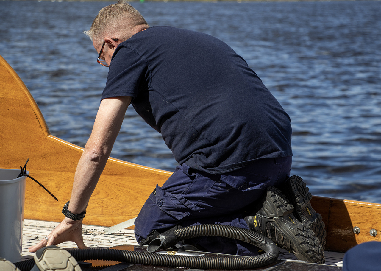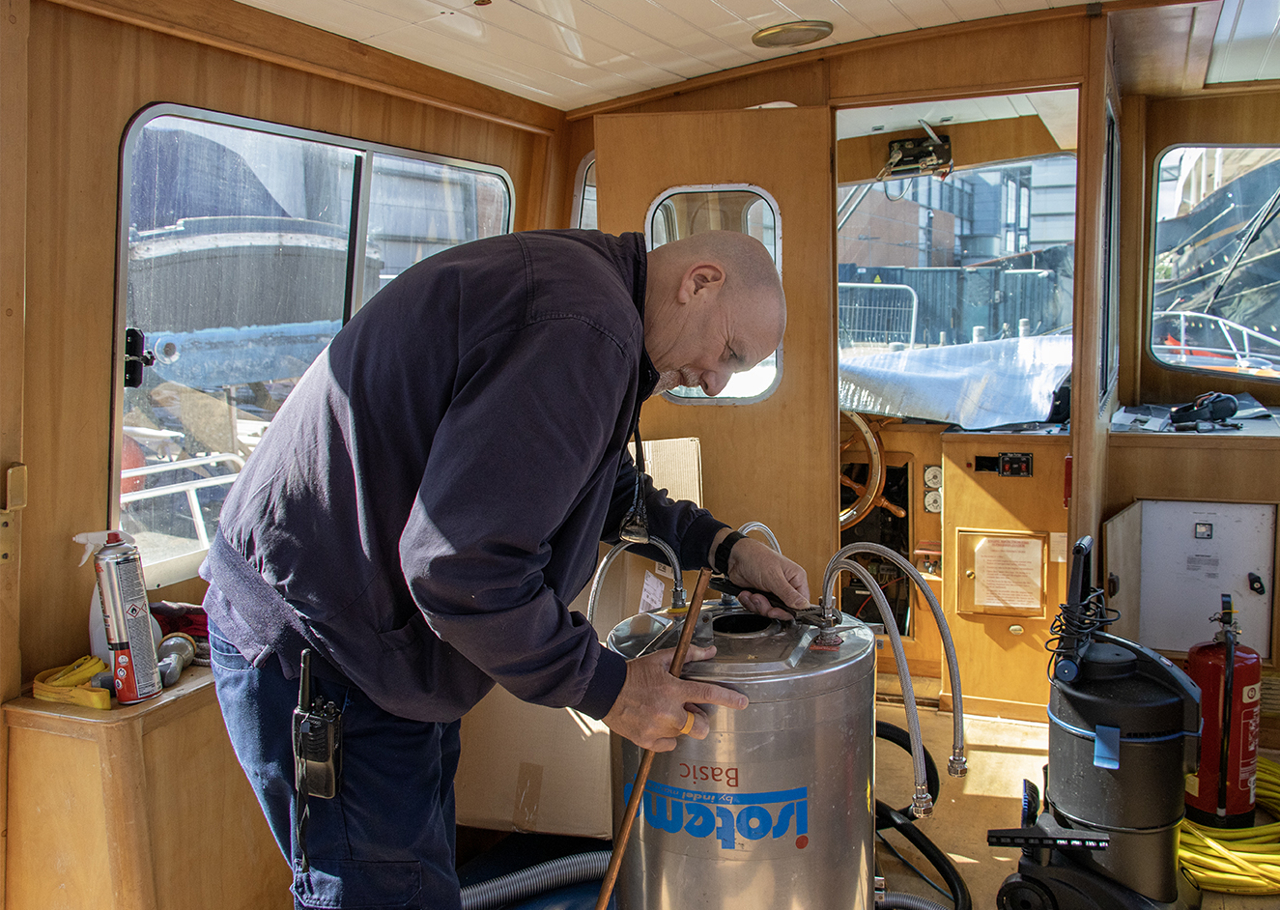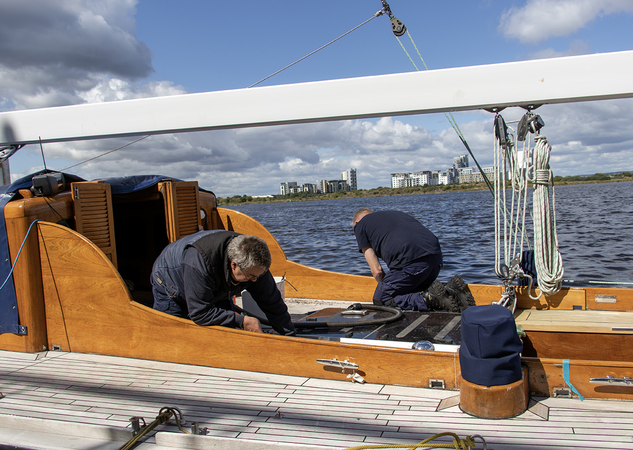 Gary and Mark re-doing an area of the caulking behind the doghouse on Royal Racing Yacht Bloodhound.