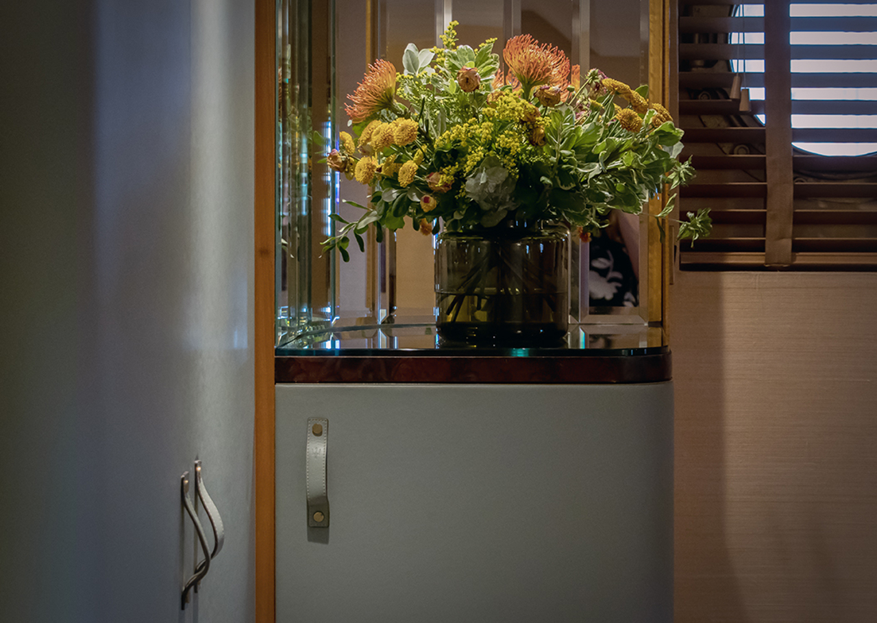 A big sky reflected in the large windows of the Tearoom with Royal Racing Yacht Bloodhound in the water.
