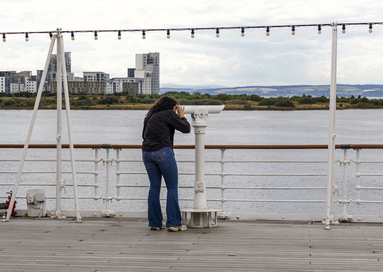 On the Verandah Deck, visitors enjoy using the telescope to take in the views across the Firth of Forth.