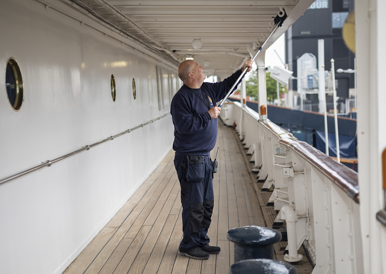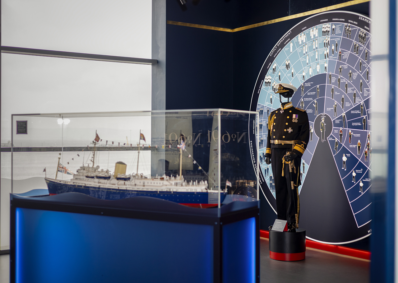 In our new Visitor Centre visitors can view a 1/72 scale model of Britannia, built by Ray Scrivens, which sits alongside many historic images and uniforms from the Royal Yacht.
