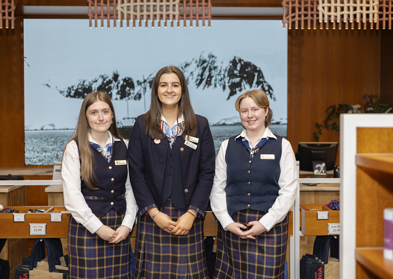 Members of our Retail team, Mia, Nicole, and Alaina, are ready to help visitors to choose the perfect memento of their day aboard.