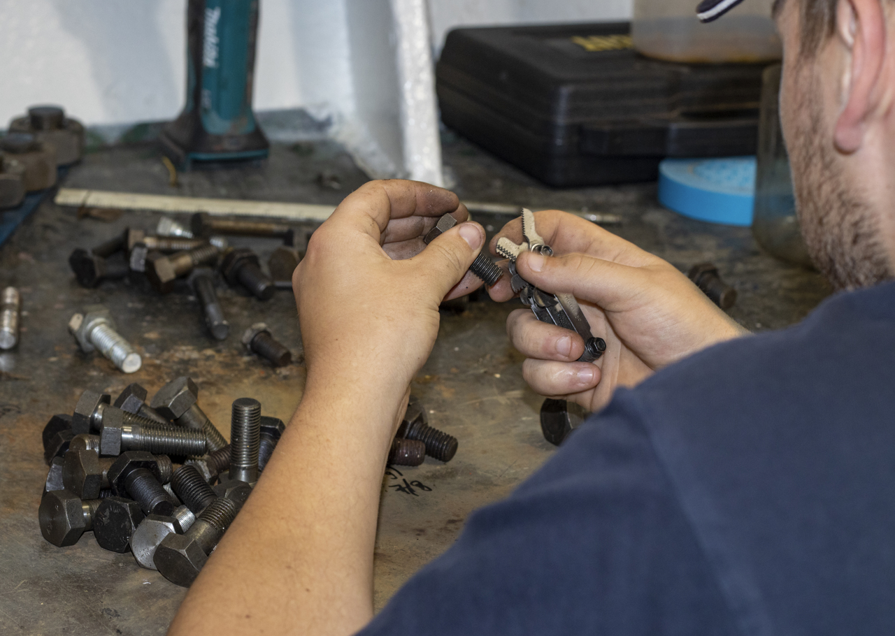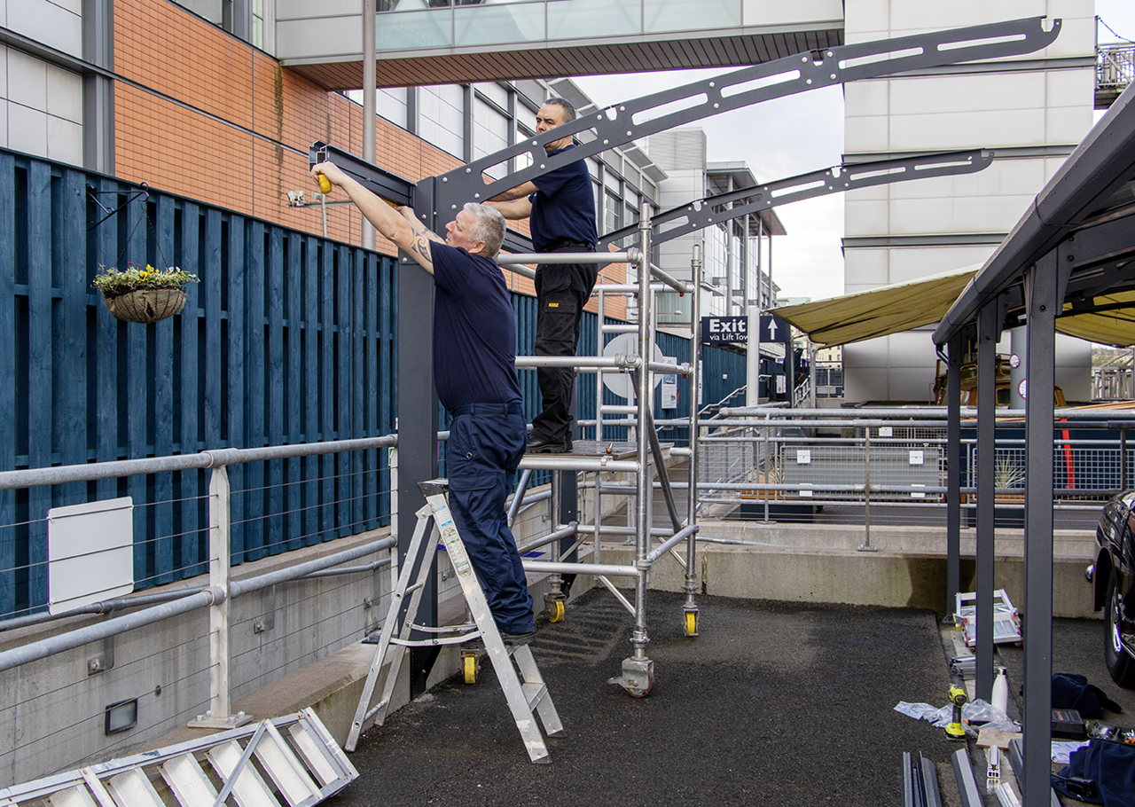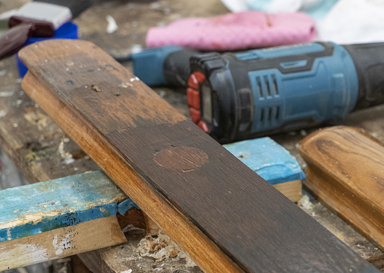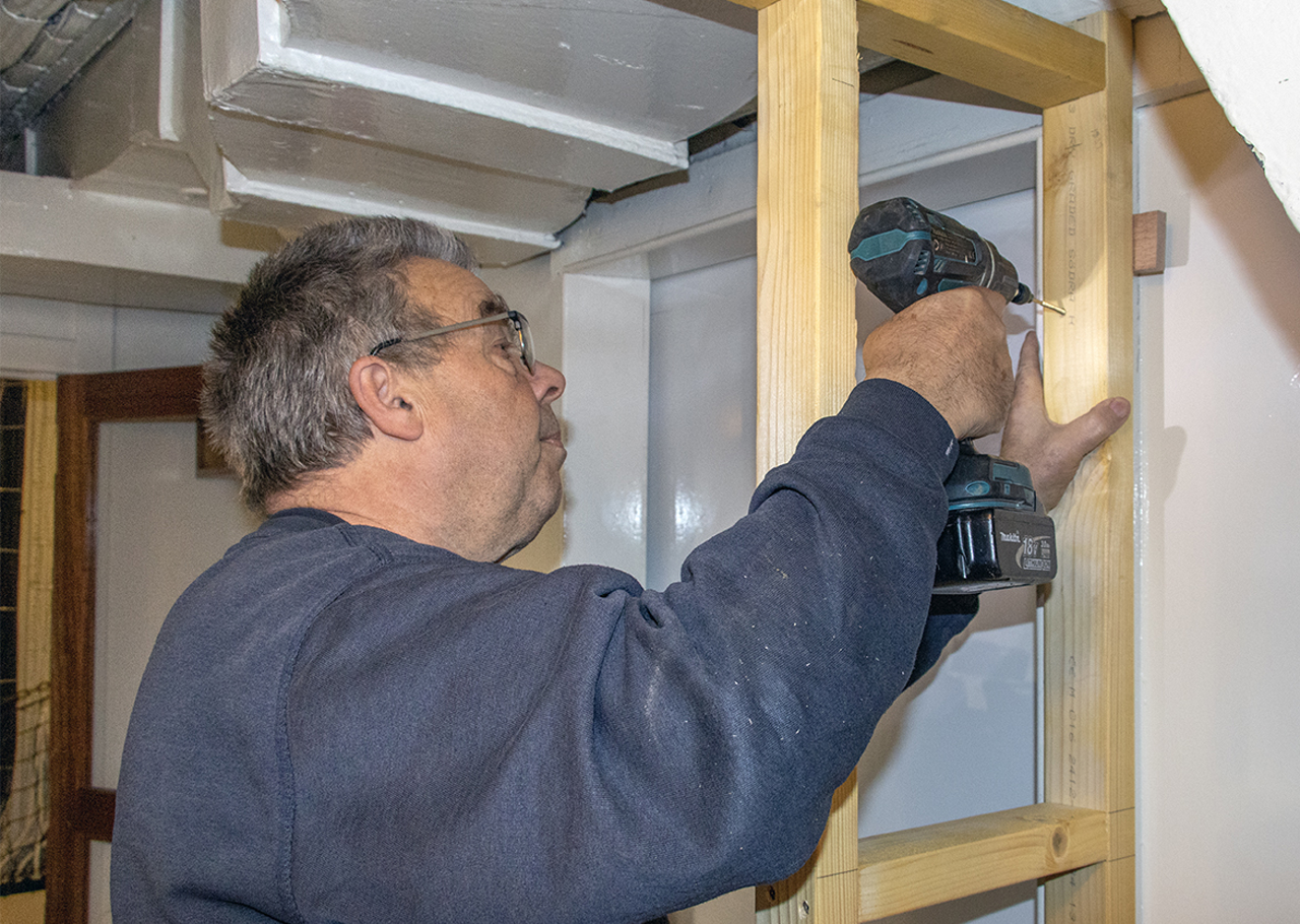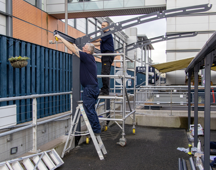 Facilities Officers Paul and Kirk building a new canopy which will cover the two-person keelboat, Coweslip.