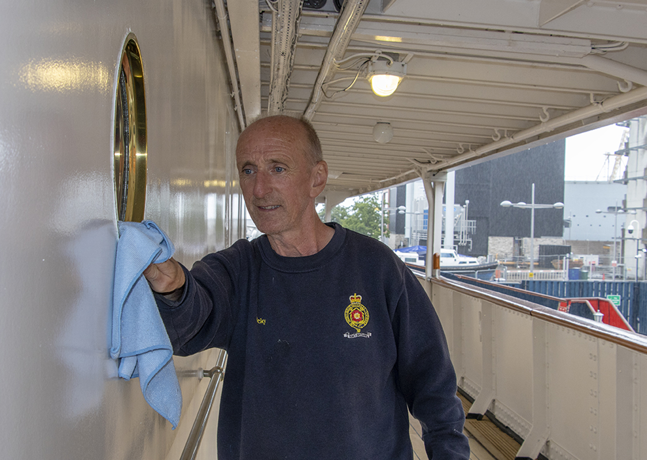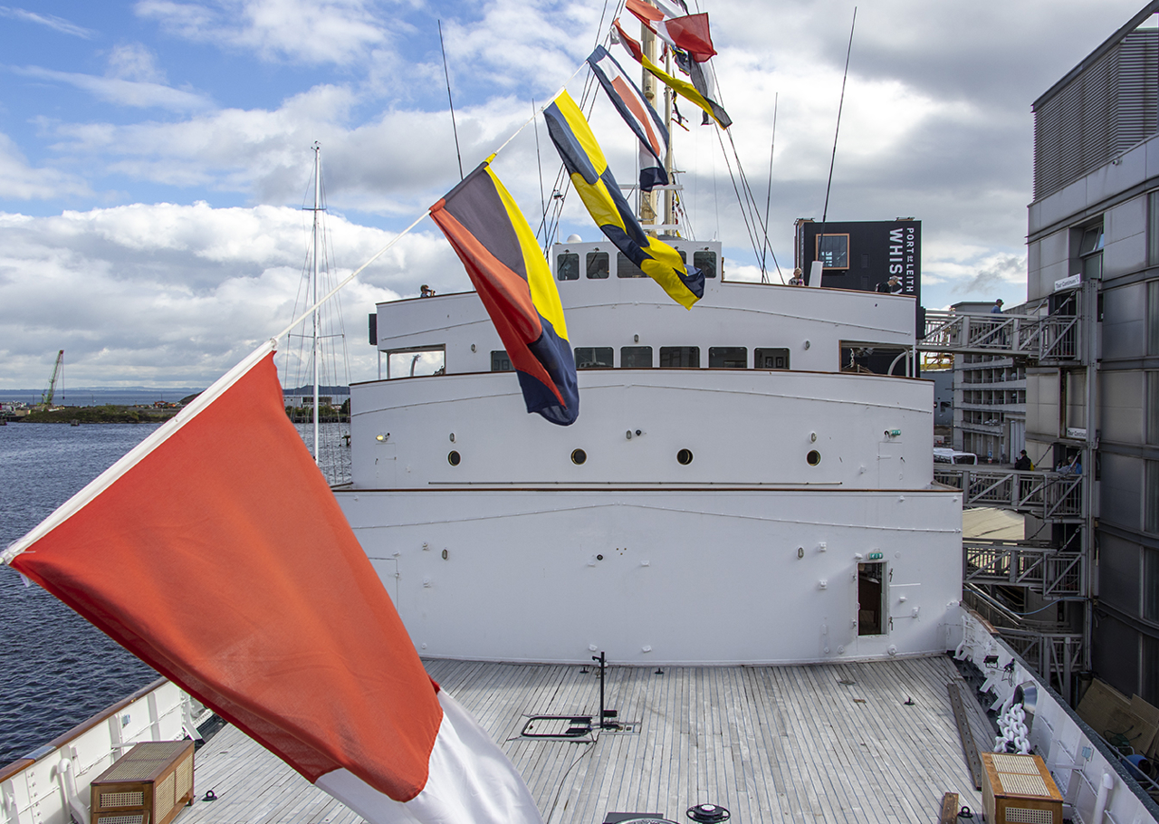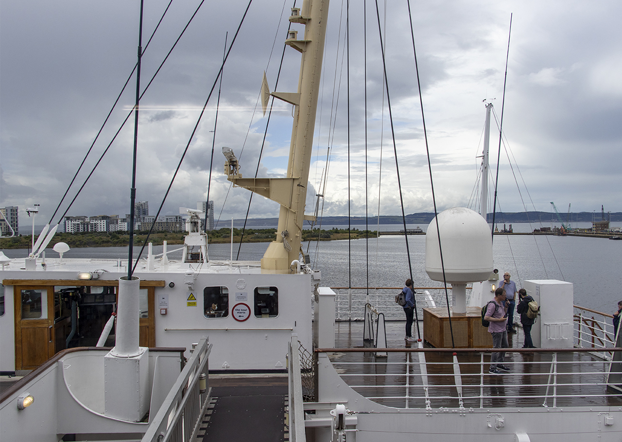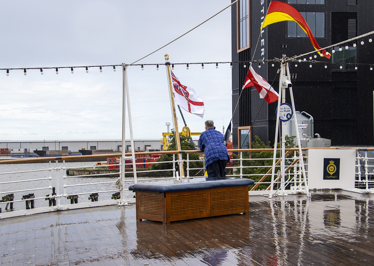 The Verandah Deck, where a visitor is learning about the unique history of Queen Elizabeth II's former floating palace through the audio tour.