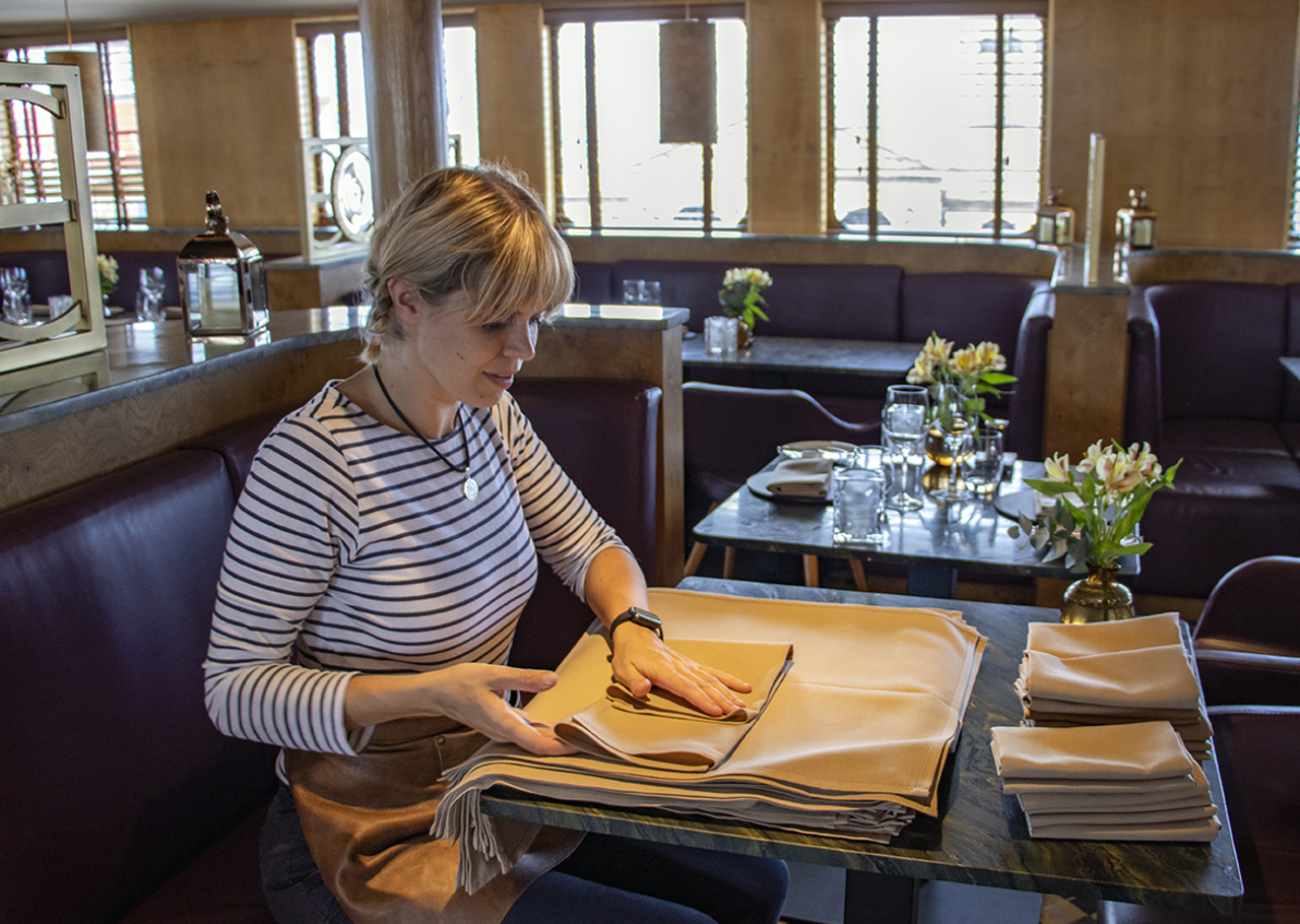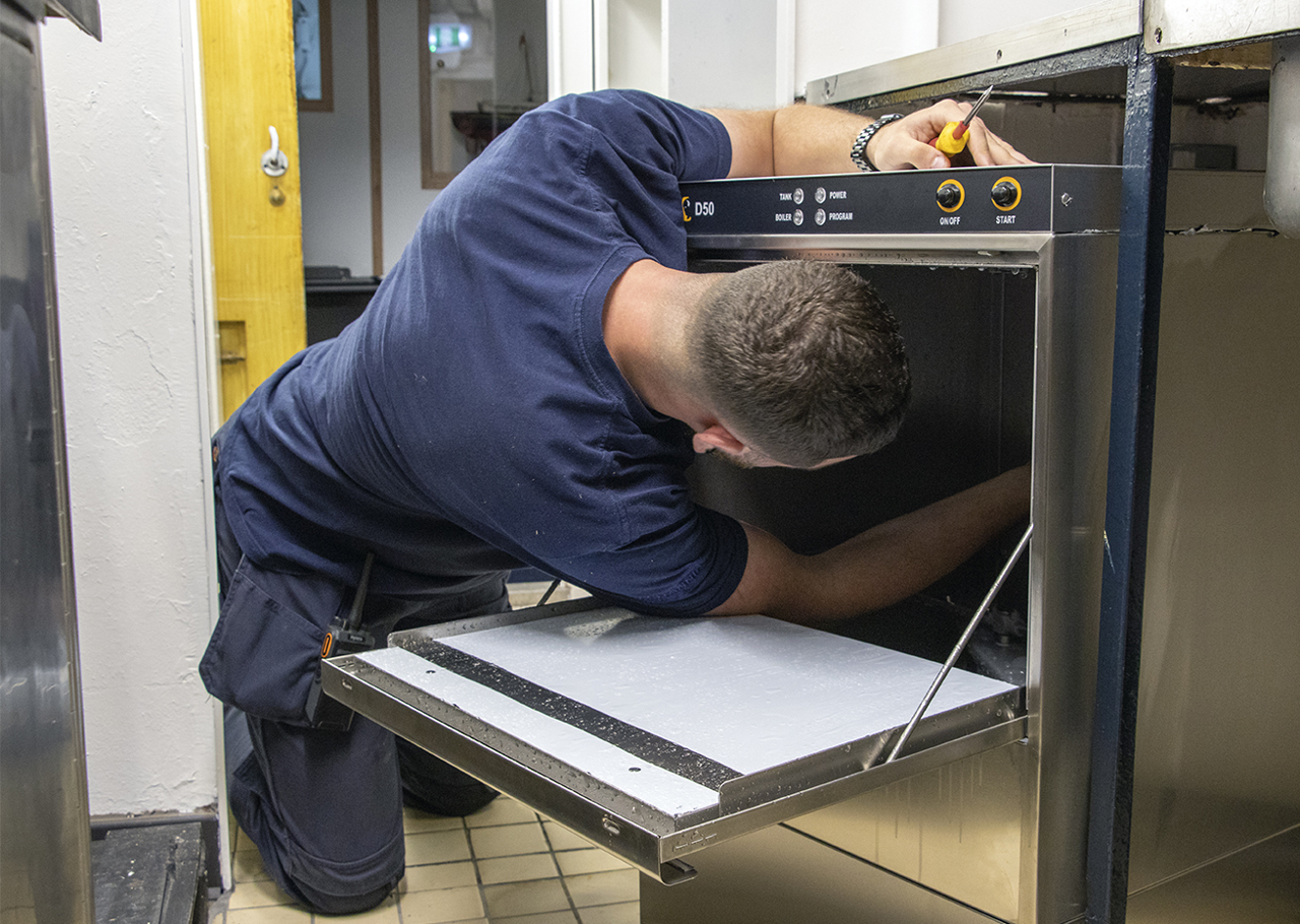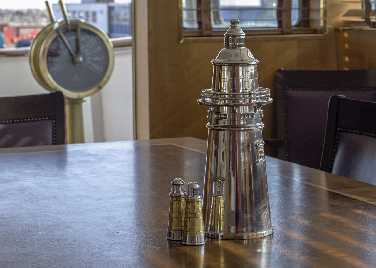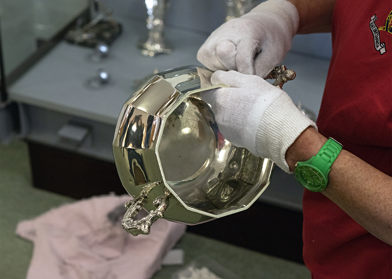 The beautiful silverware in the Officers' Wardroom , where the Officers would dine and relax, is kept perfectly pristine by the Housekeeping Team.