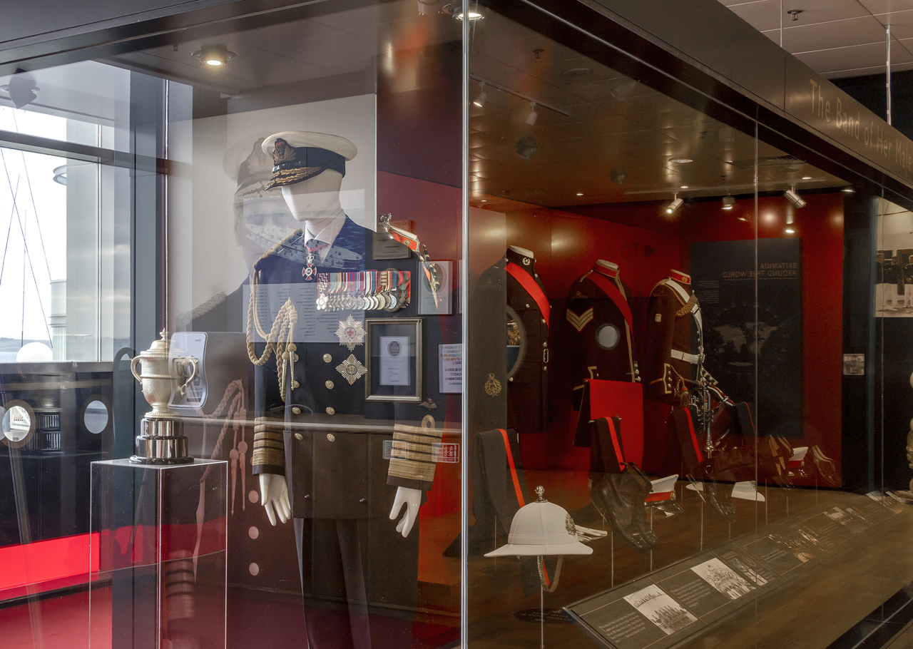 Uniforms on display including one which belonged to Prince Philip, and those from the Royal Marines Band.