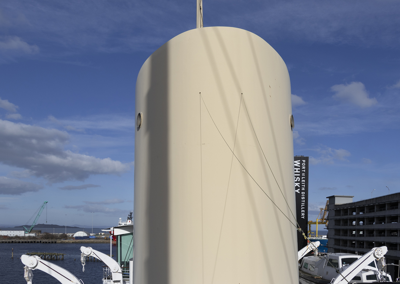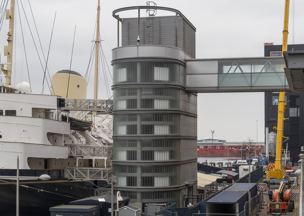 A crane loading scaffolding onto Britannia to allow the Maintenance Team to paint the Funnel. This was planned for during the removal of the current bridge walkway, which connects the Visitor Centre at Ocean Terminal to Britannia.