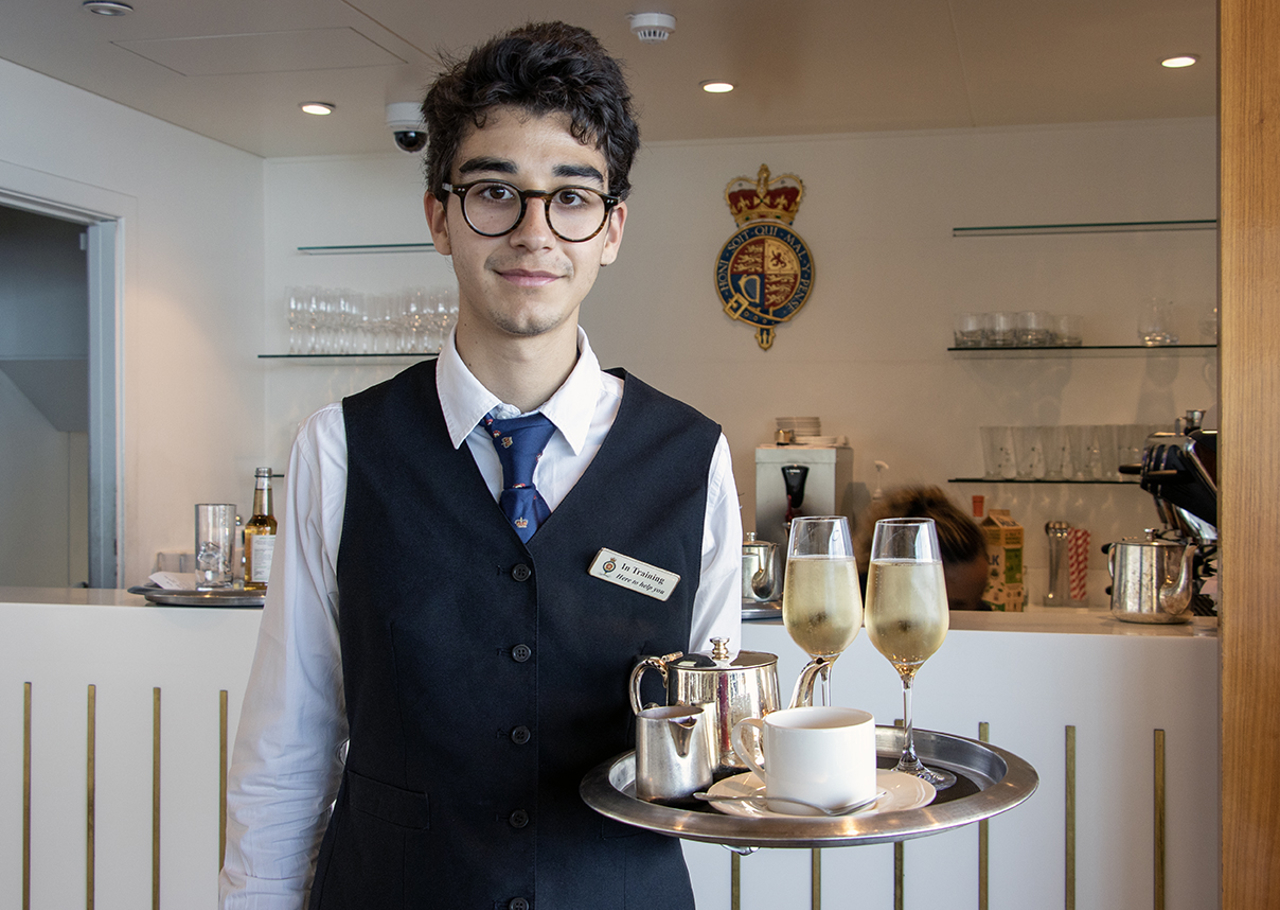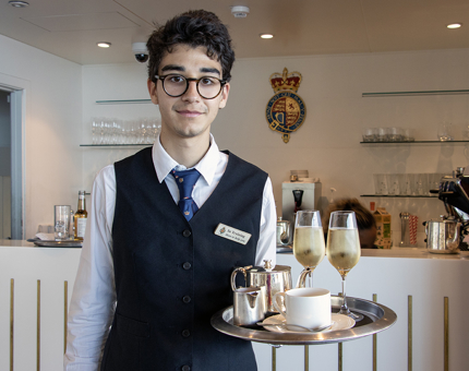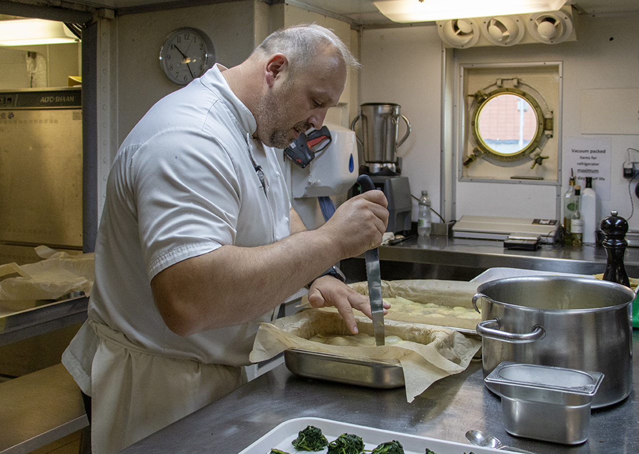 Sous Chef, Raf, crafting culinary perfection as he prepares potato gratin for an exclusive evening event on board the Royal Yacht.