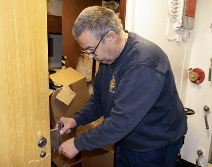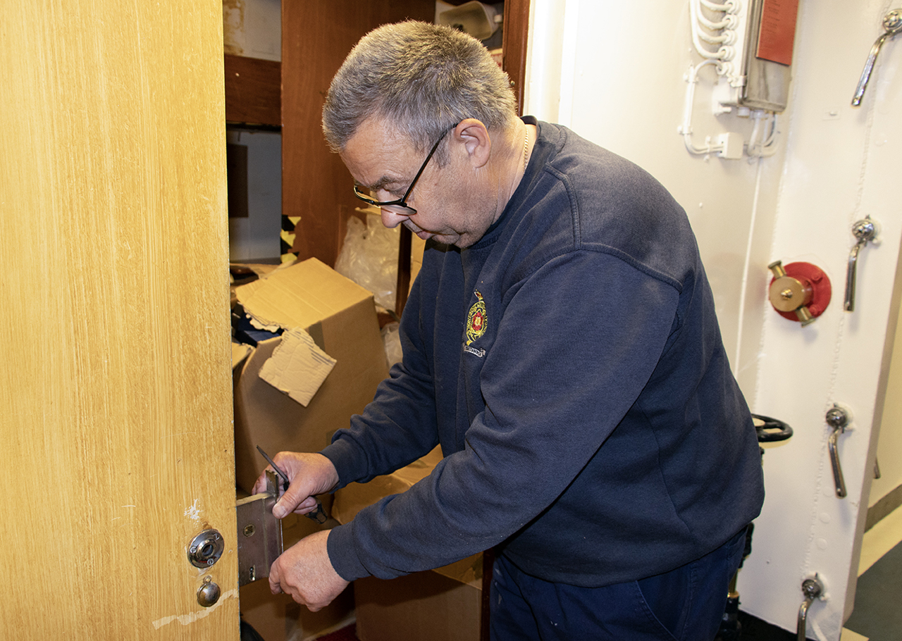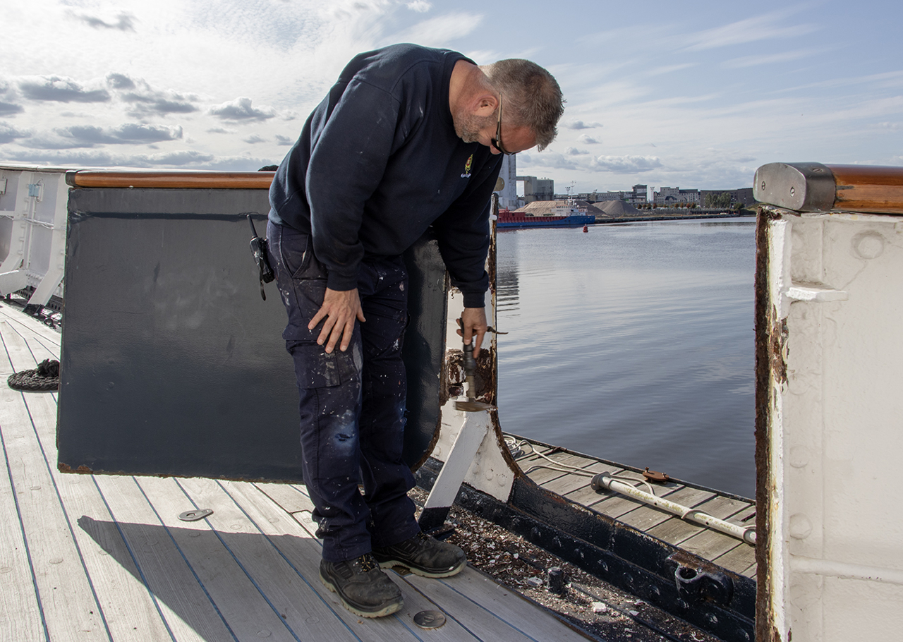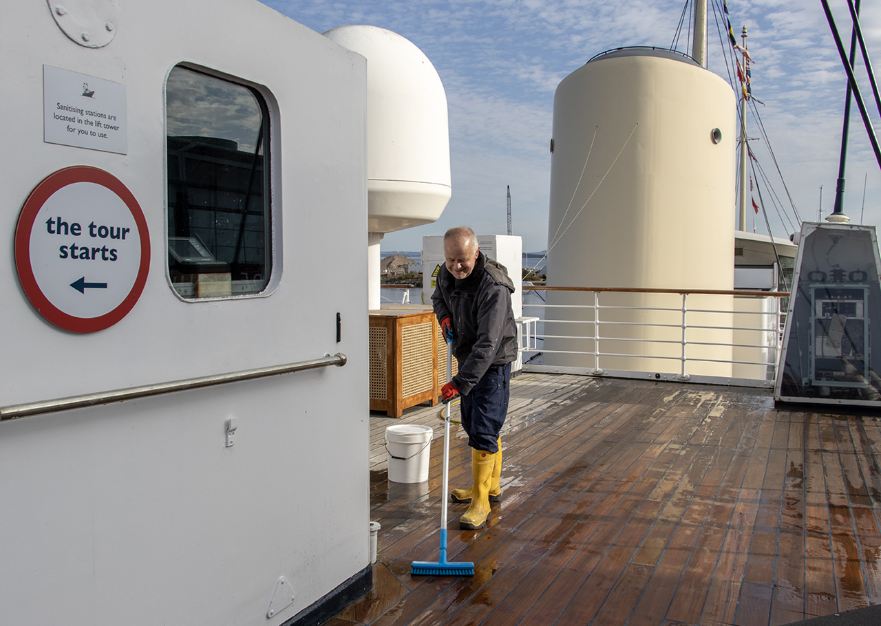 Nigel, scrubbing the Flag Deck, behind the Bridge, ensuring Britannia's impeccable standards are maintained.