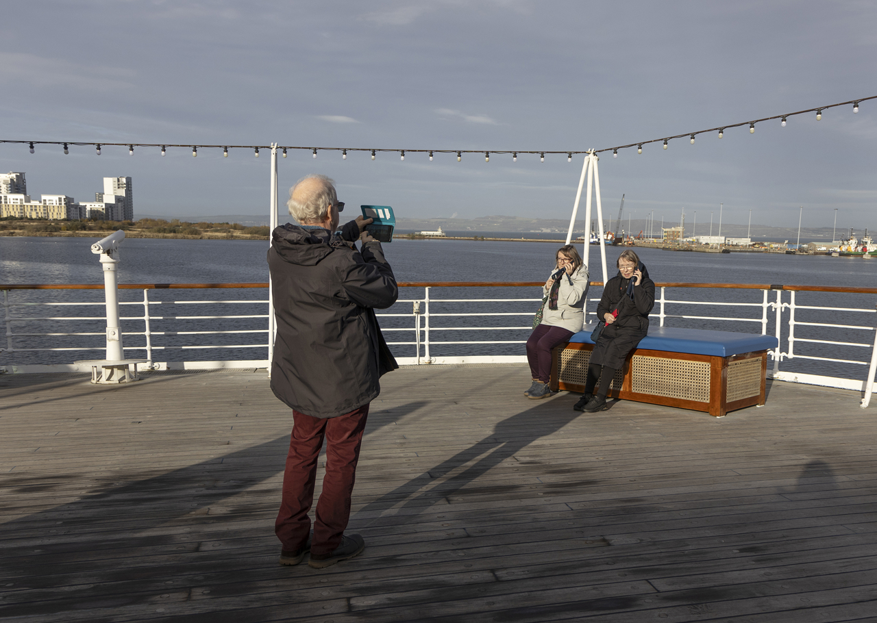 A sunny day outside on the Verandah Deck as visitors enjoy listening to stories on the audio guided tour.
