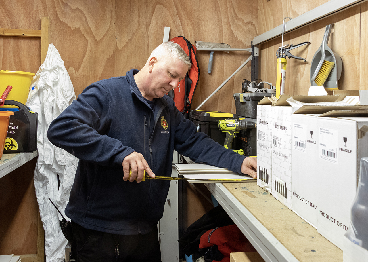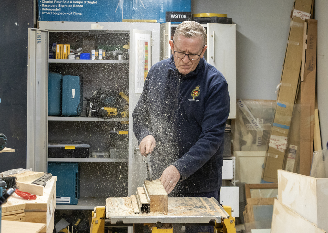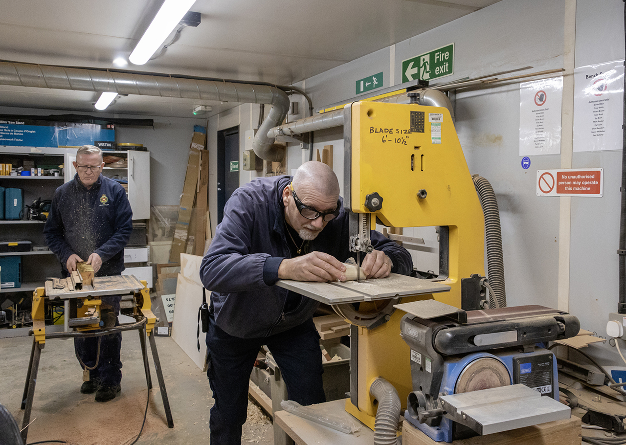 In the Maintenance Workshop, from left to right, Mark using the circular saw and Stuart cutting a bung for a drainpipe for the drainage system.