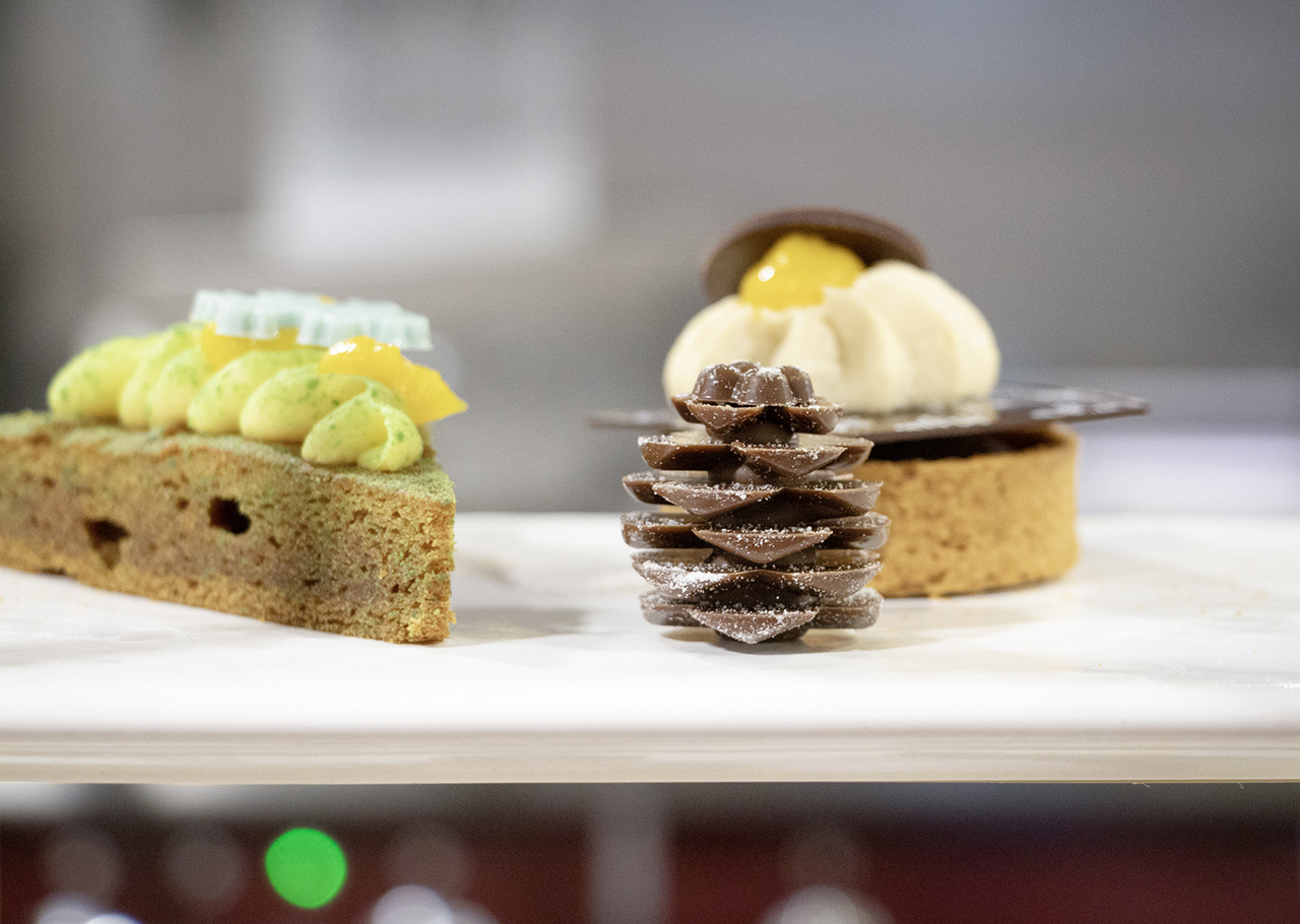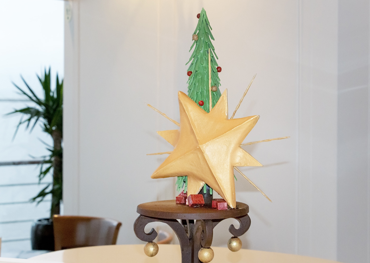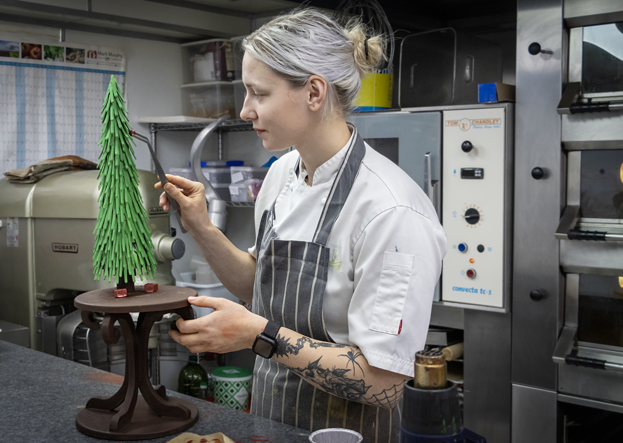 Amelia, Chef de Partie, creating a stunning sculpture made entirely of chocolate, for display in the Royal Deck Tearoom.