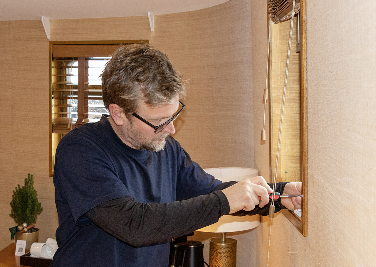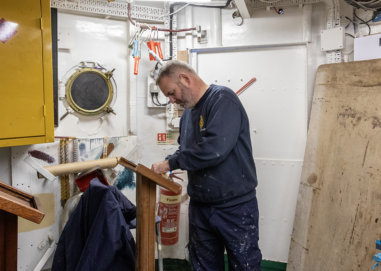 Shelbi, Housekeeper, ensuring that Queen Elizabeth II's favourite room on board, the Sun Lounge, is cleaned to sparkling perfection.