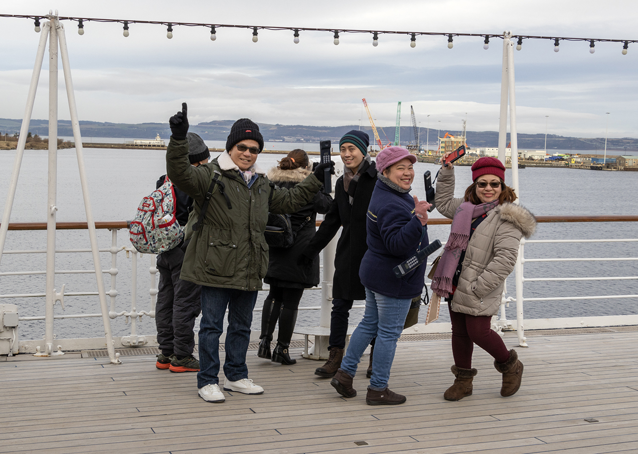 A group of visitors enjoy the views from a telescope on the Verandah Deck while listening to their complimentary audio guide.